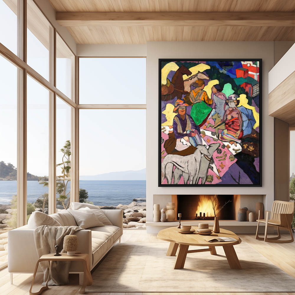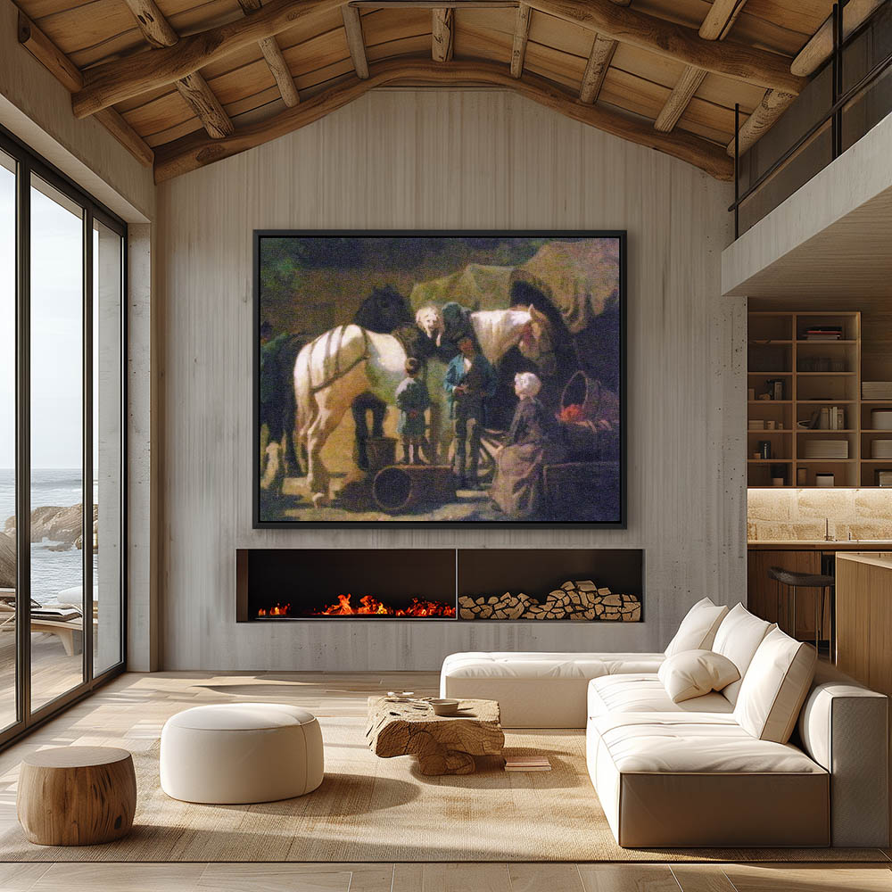 Vintage Figurative Landscape Painting with Figures and Horses and a Dog