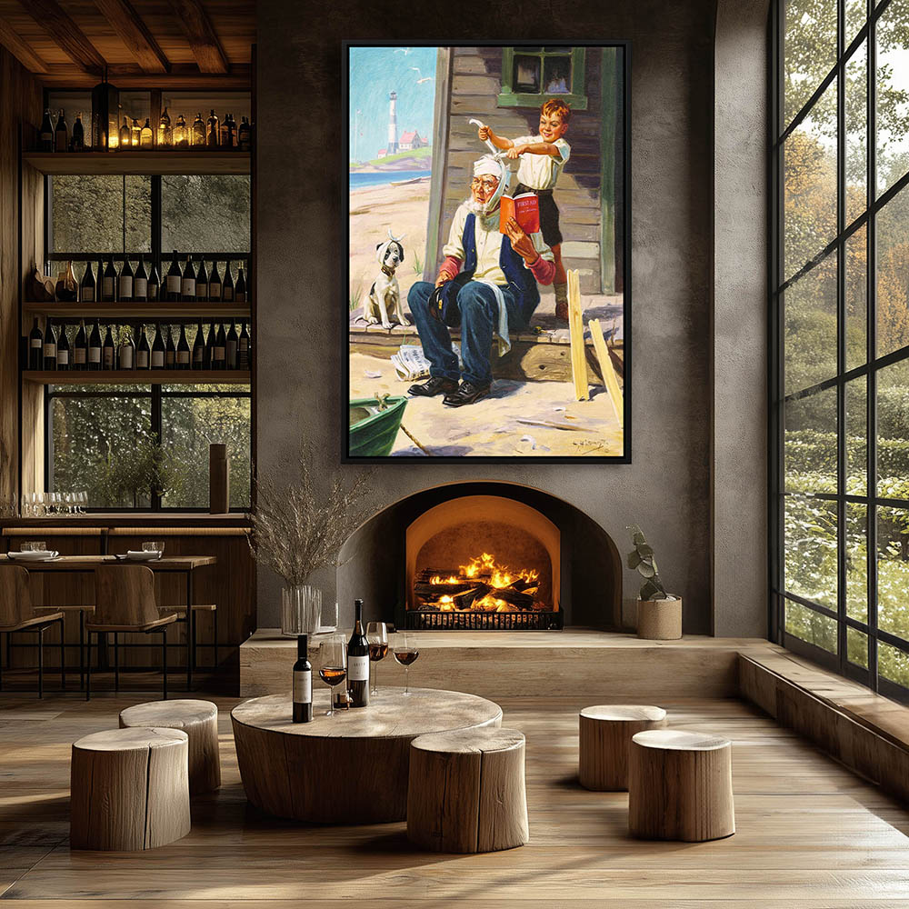 Figurative Painting with a Boy Doctoring a Man and Dog