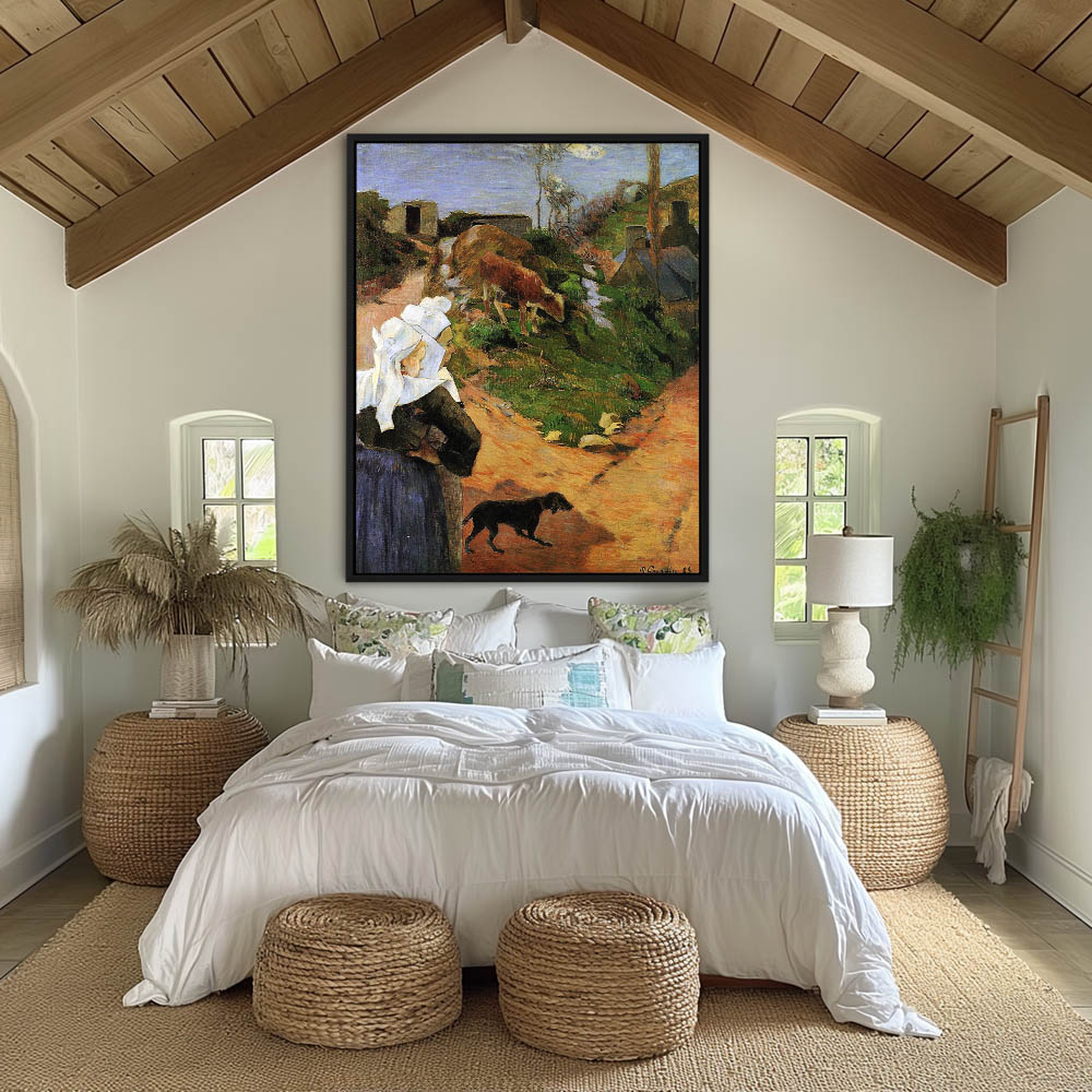 Vintage Landscape Painting with a Woman on a Road with a Cow and Dog