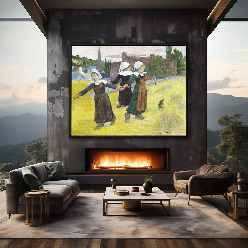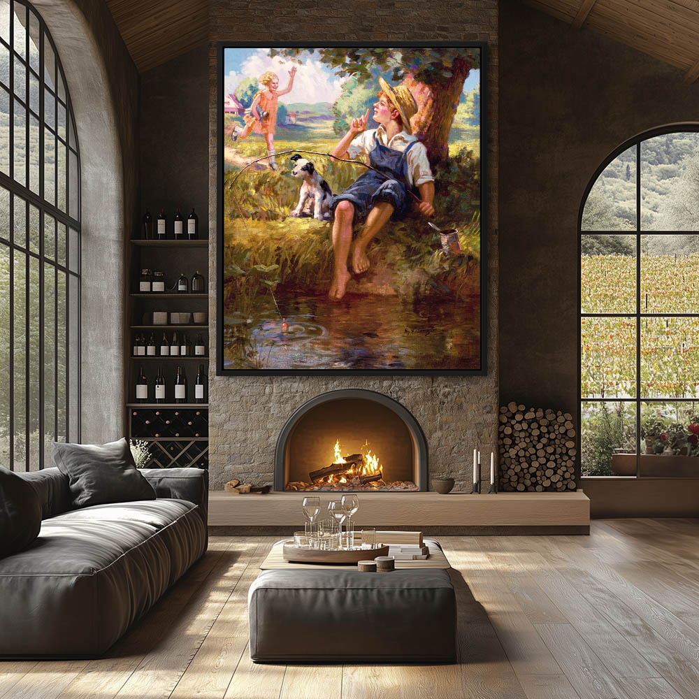 Landscape Painting with a Boy Fishing with his puppy and a Girl Running up