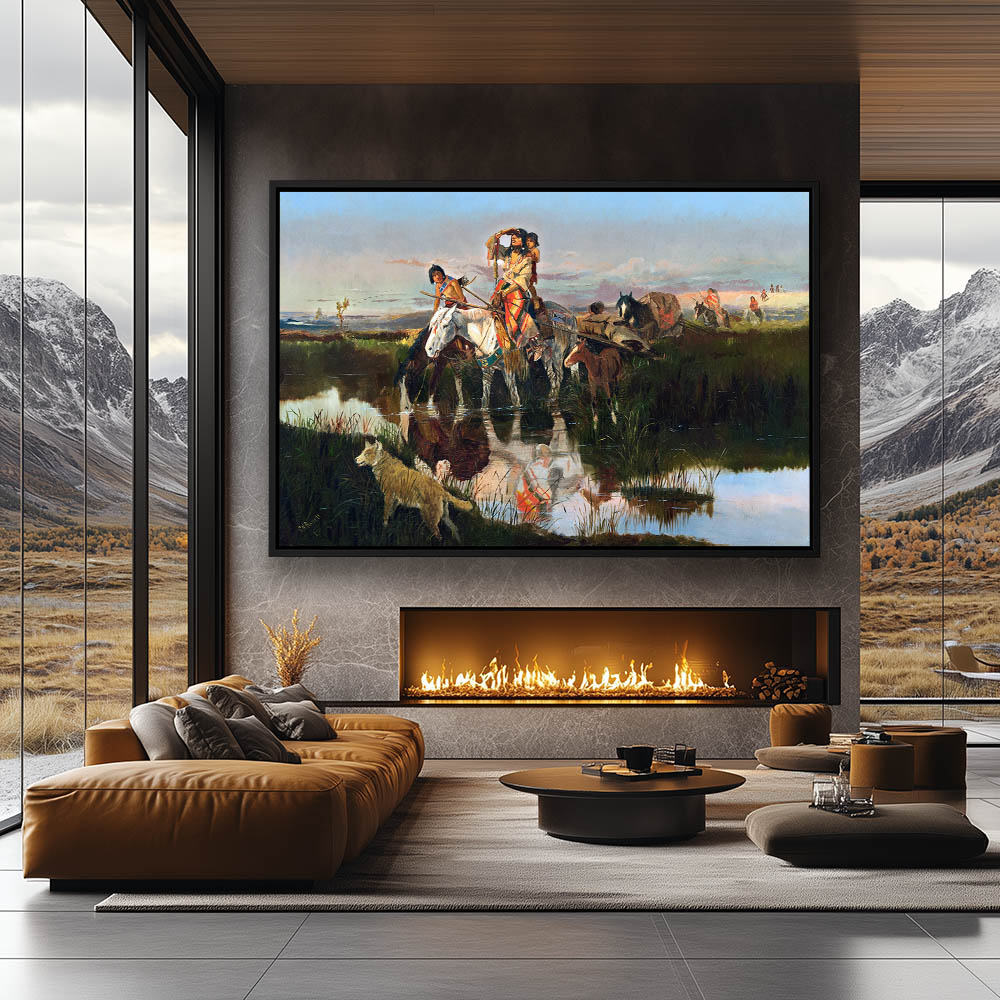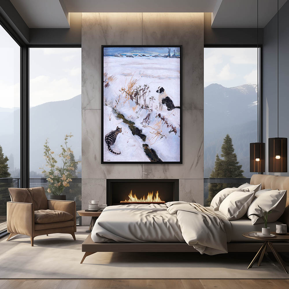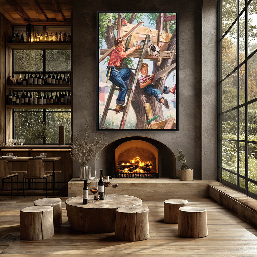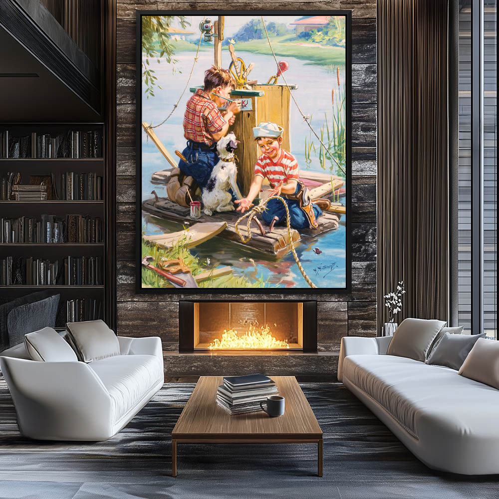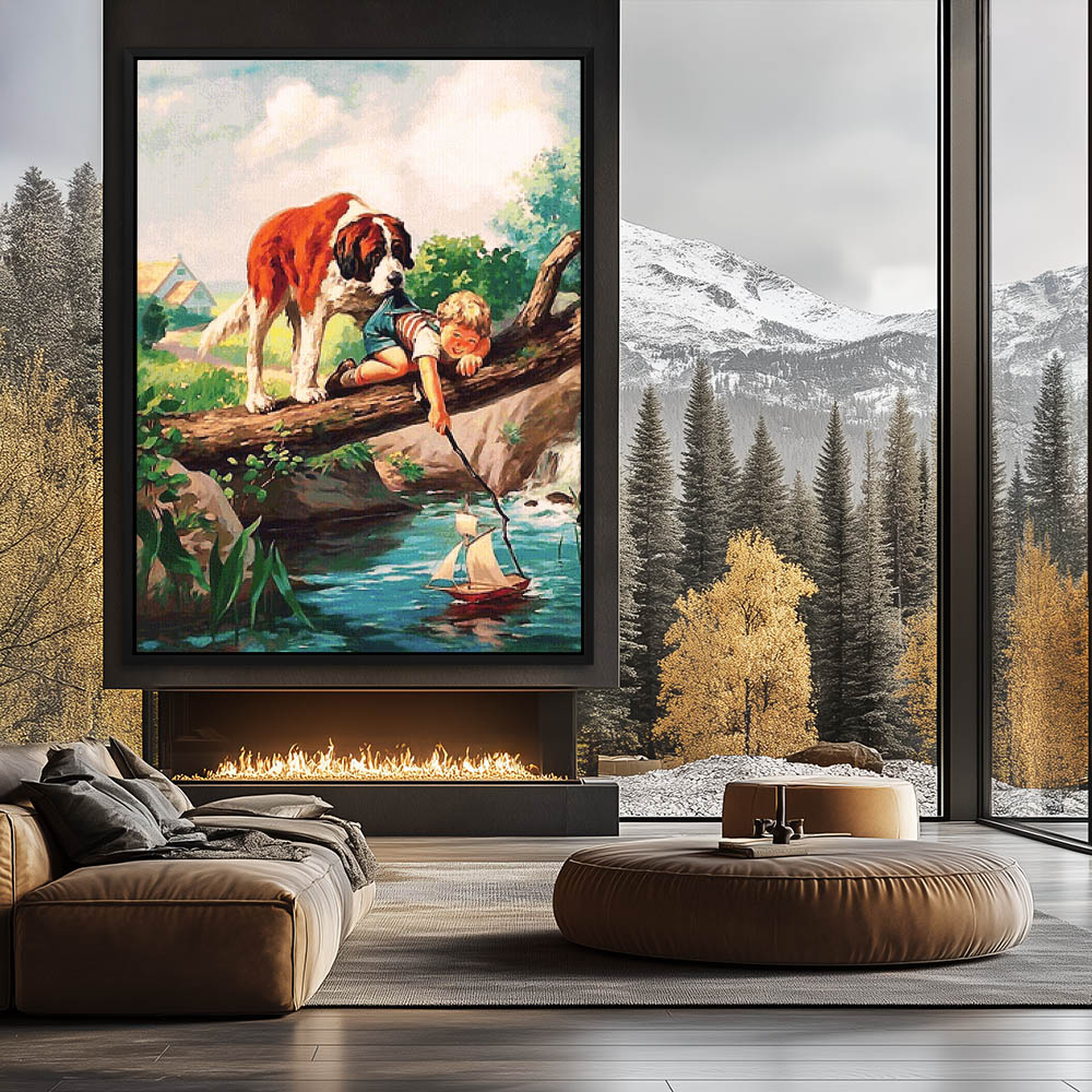 Landscape Painting with a Boy Trying to Get His Boat as a Dog Holds him Steady