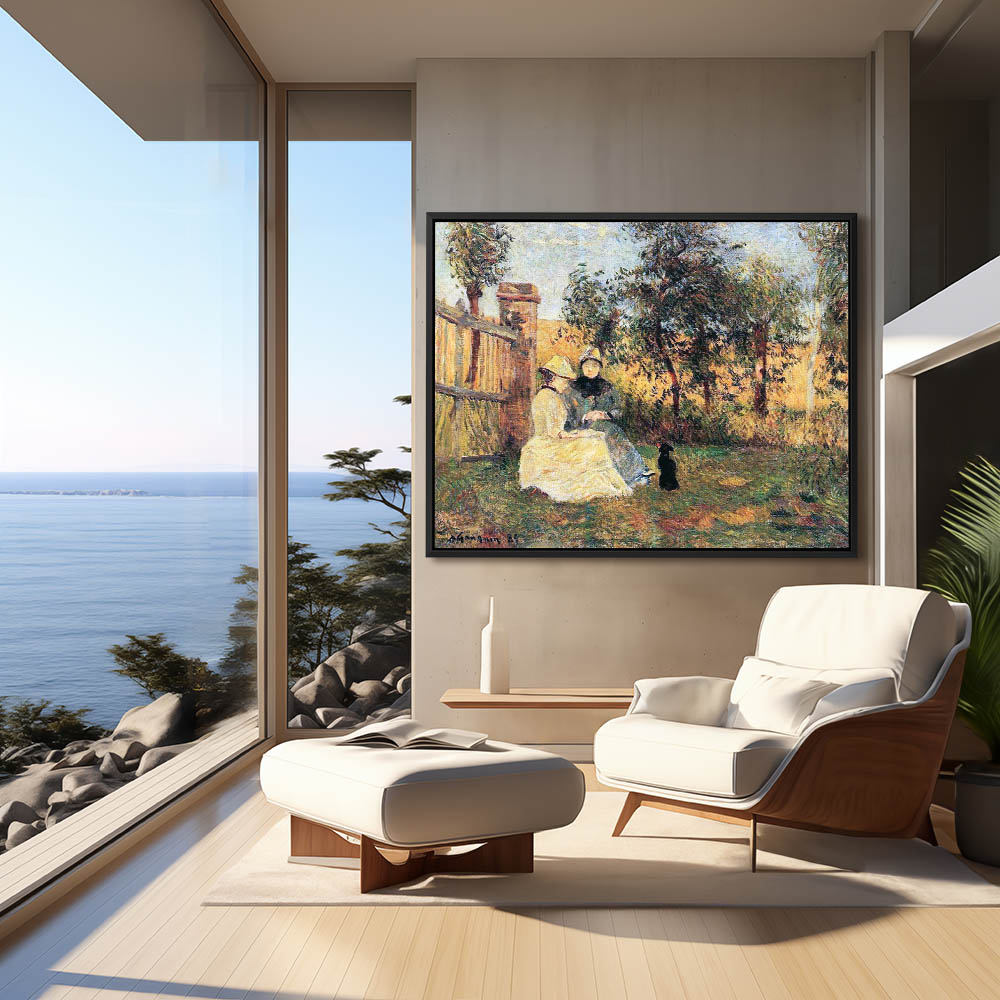 Vintage Landscape Painting of Two women having a Conversation in the Garden with a Dog Watching