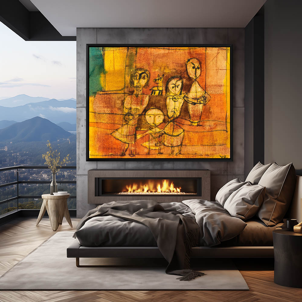 Abstract group of children with dog on yellow shaded background