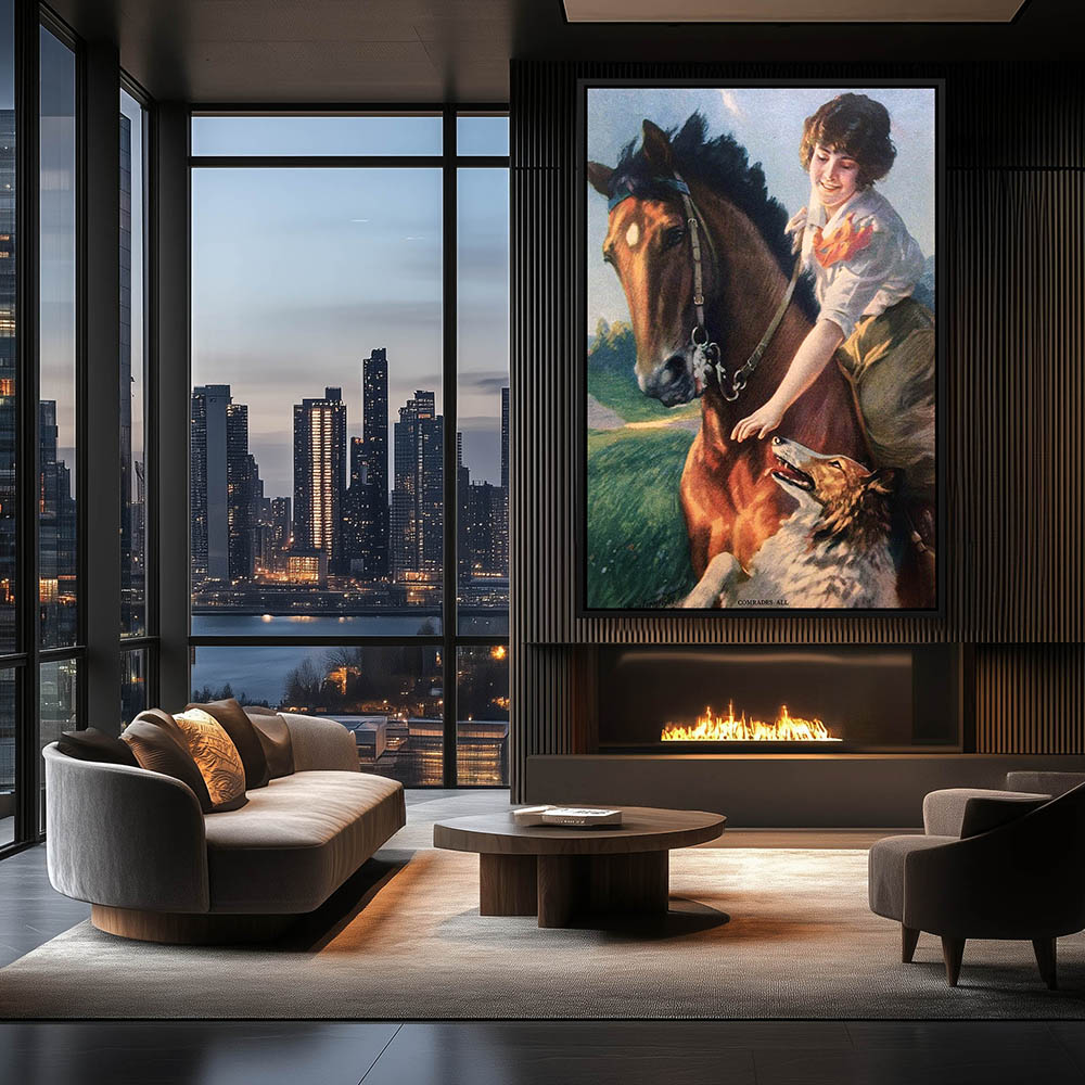 Dog alongside a girl on horseback