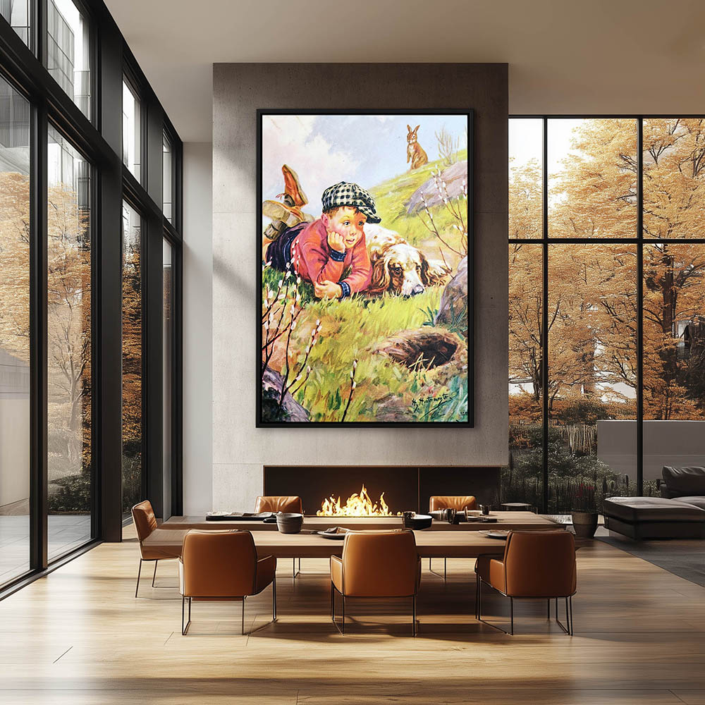 A boy and his dog watching a rabbit hole while the rabbit watches them from behind