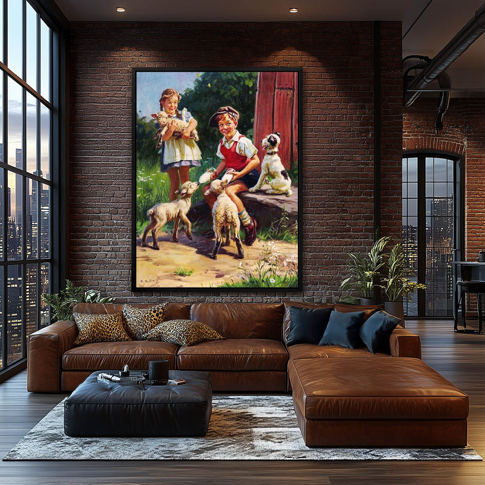 Two Children Feeding the Baby Lambs