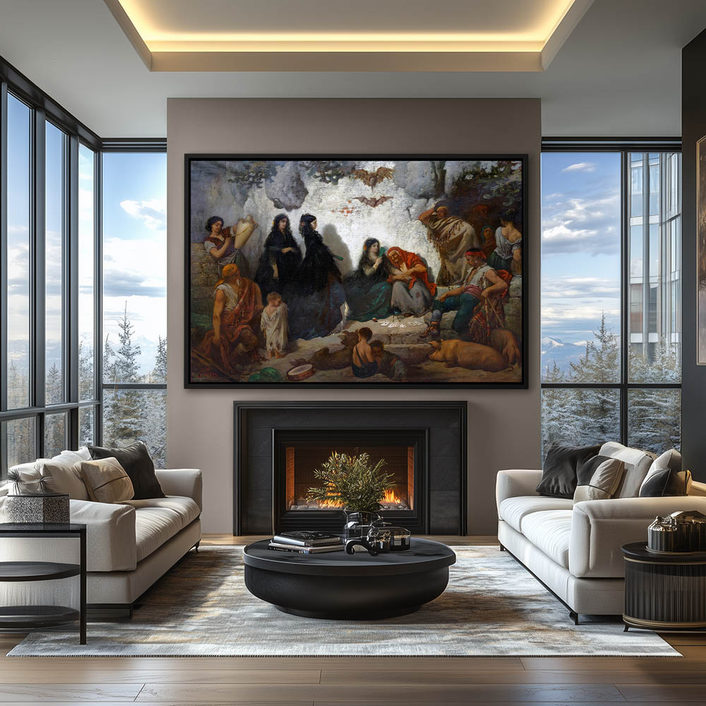 Indian women on horseback leading a group across the plains, following the buffalo