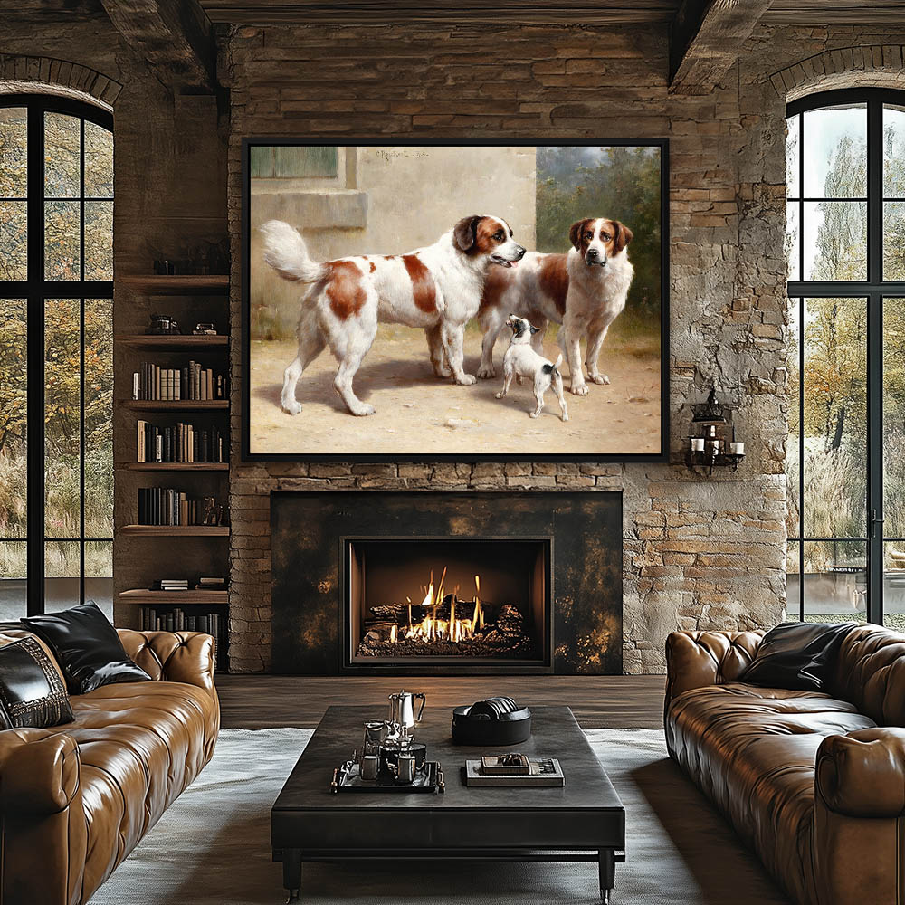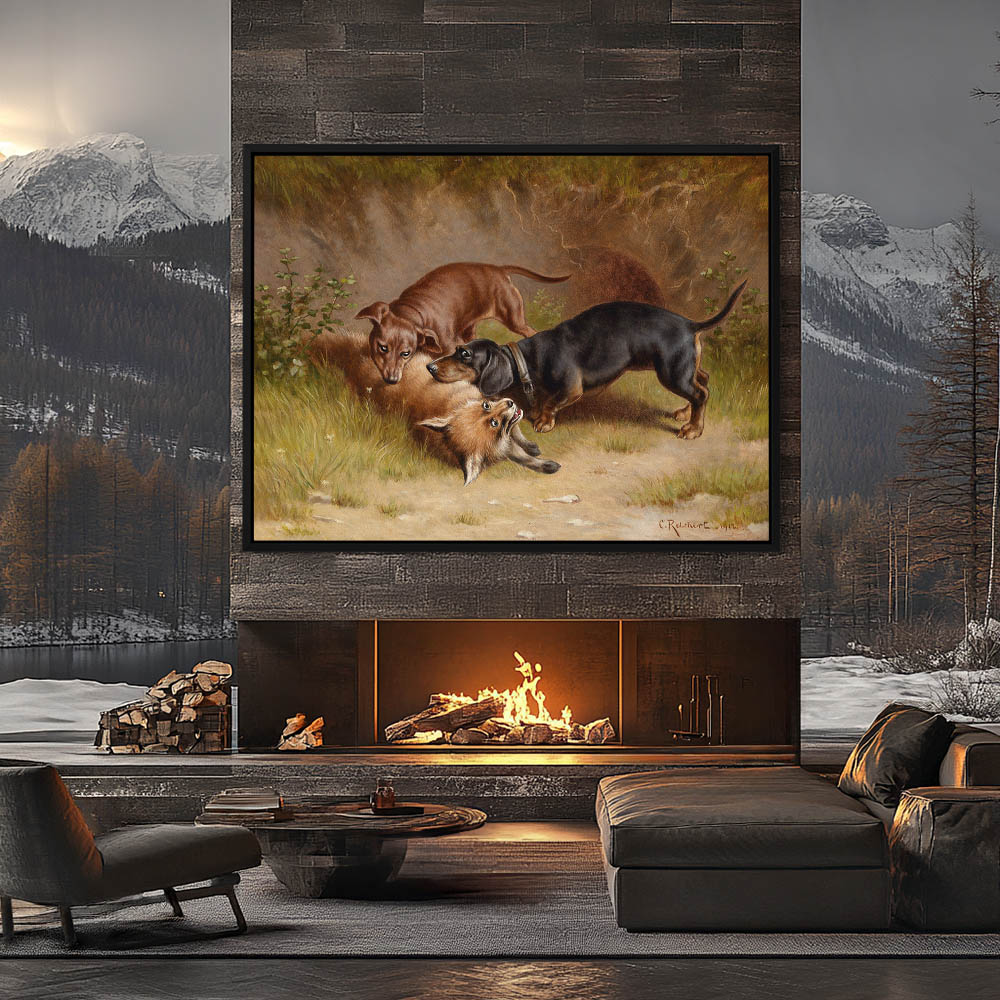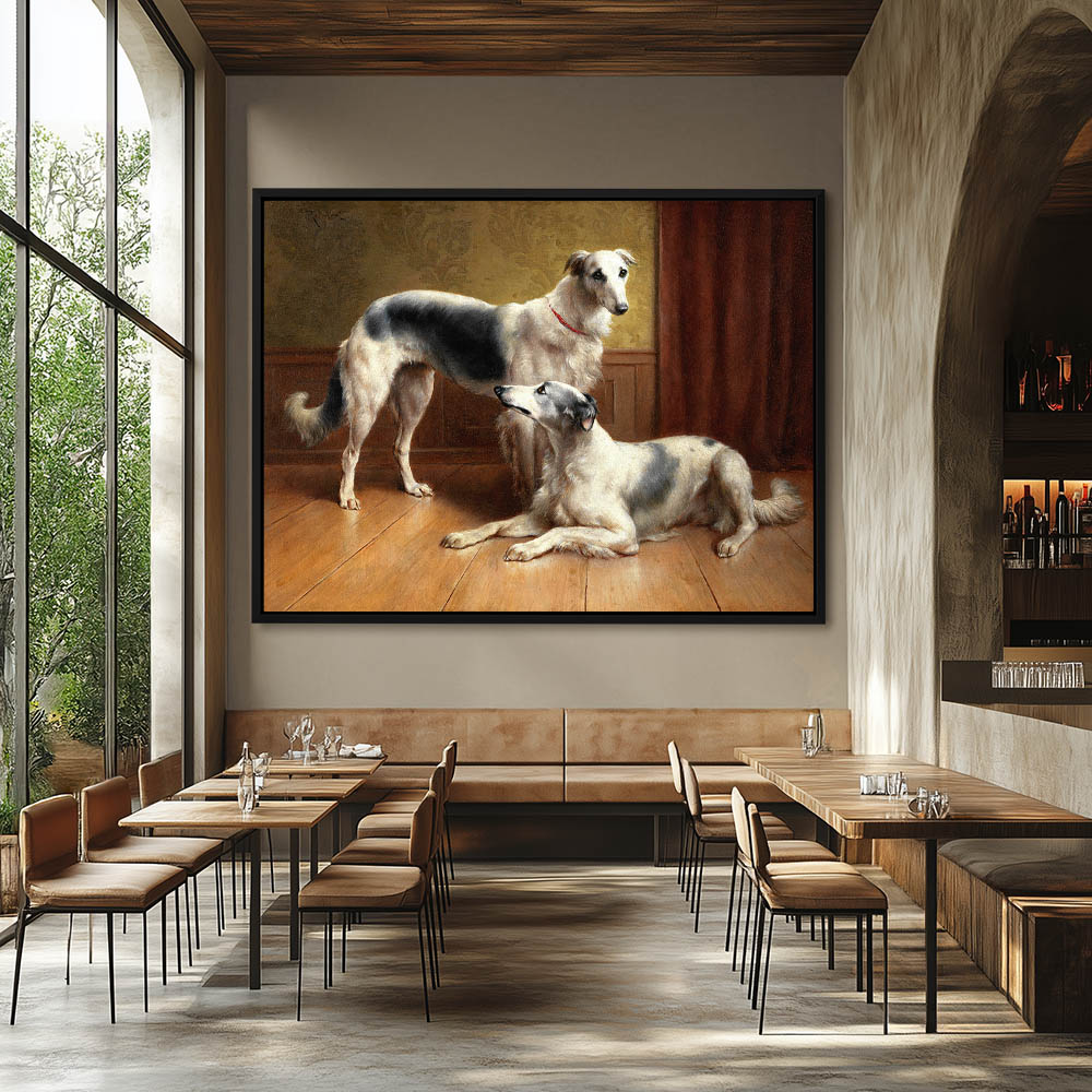 Two stylised greyhounds and two rabbits in a landscape with the setting sun