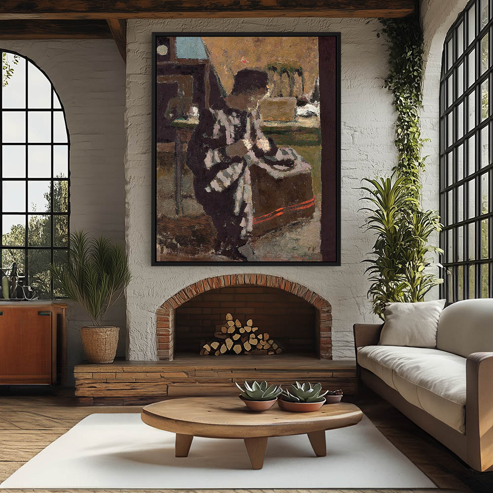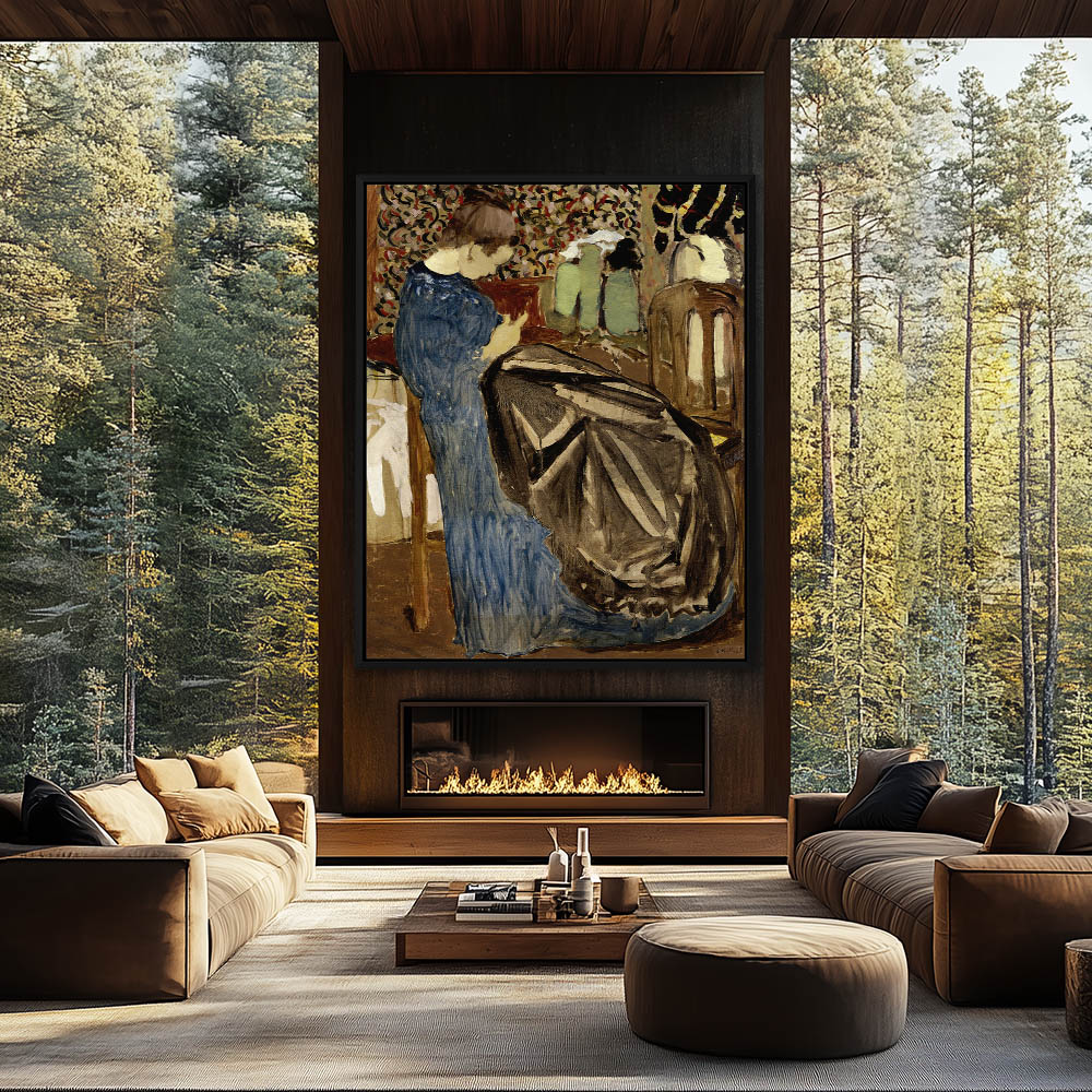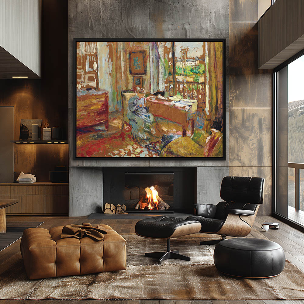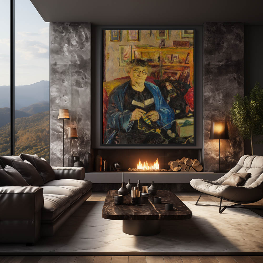 Abstract depiciton of a woman in blue sewing at a table by the window