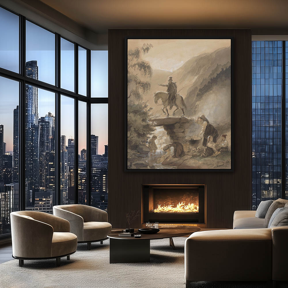 Horseback rider on the rock bridge above stops to speak to the women doing the wash in the stream, while a young boy has a music lesson