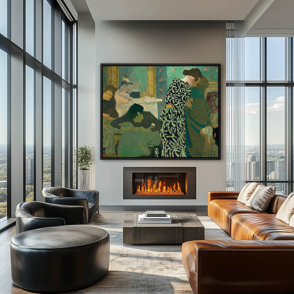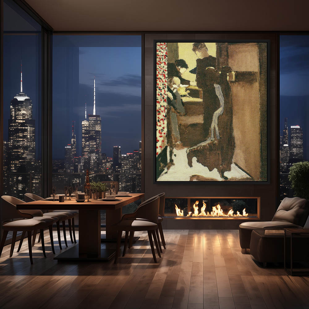 Abstract interior with several figures, one small girl hanging off a drawer in a tall chest.