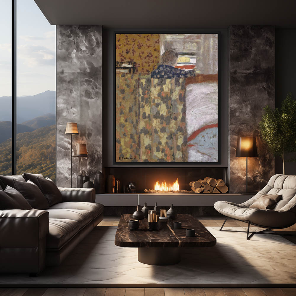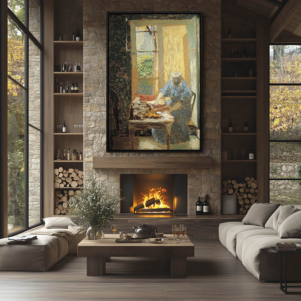 Woman working with fabric in a sunlit room with a window on the far side