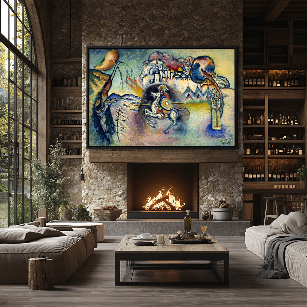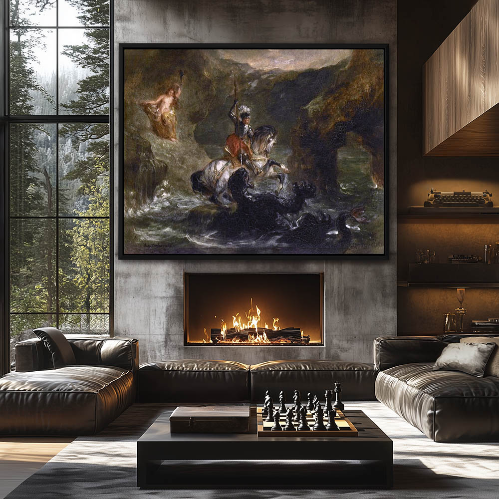Vintage Figurative Painting with Saint George Fighting the Dragon
