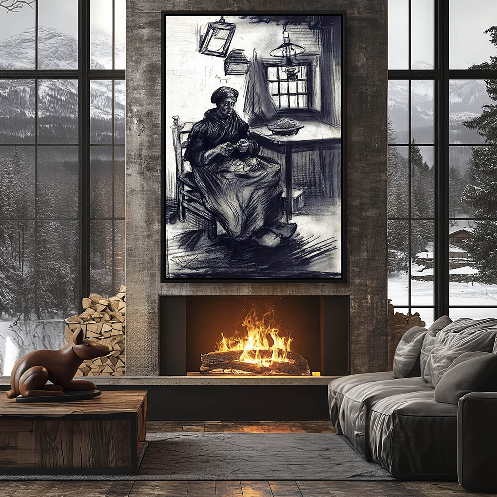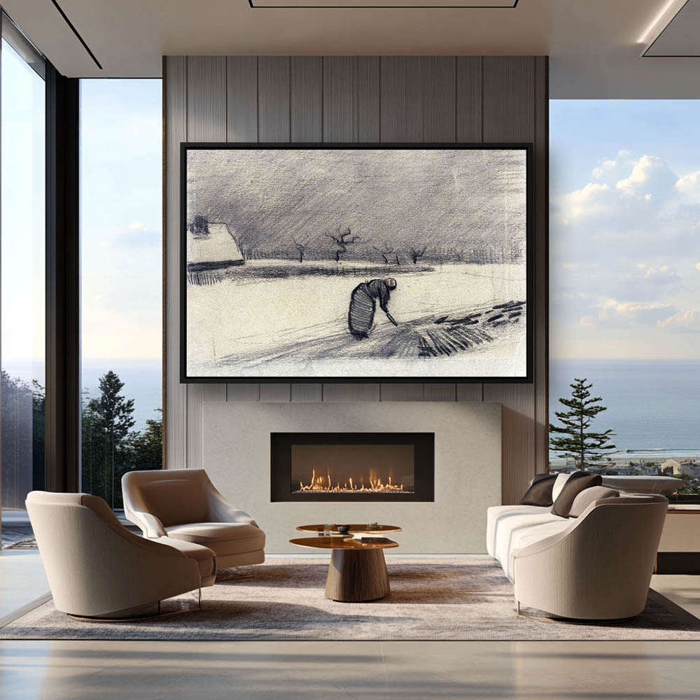 Landscape Drawing with a Woman Picking up Firewood in the Winter