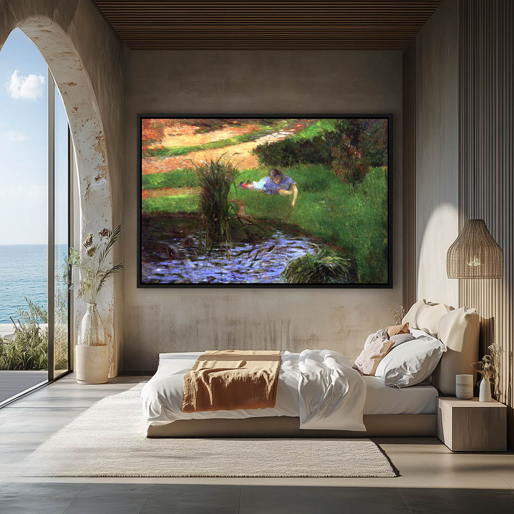 Vintage Pond Landscape Painting with a Child Laying on the Bank Watching the Ducks