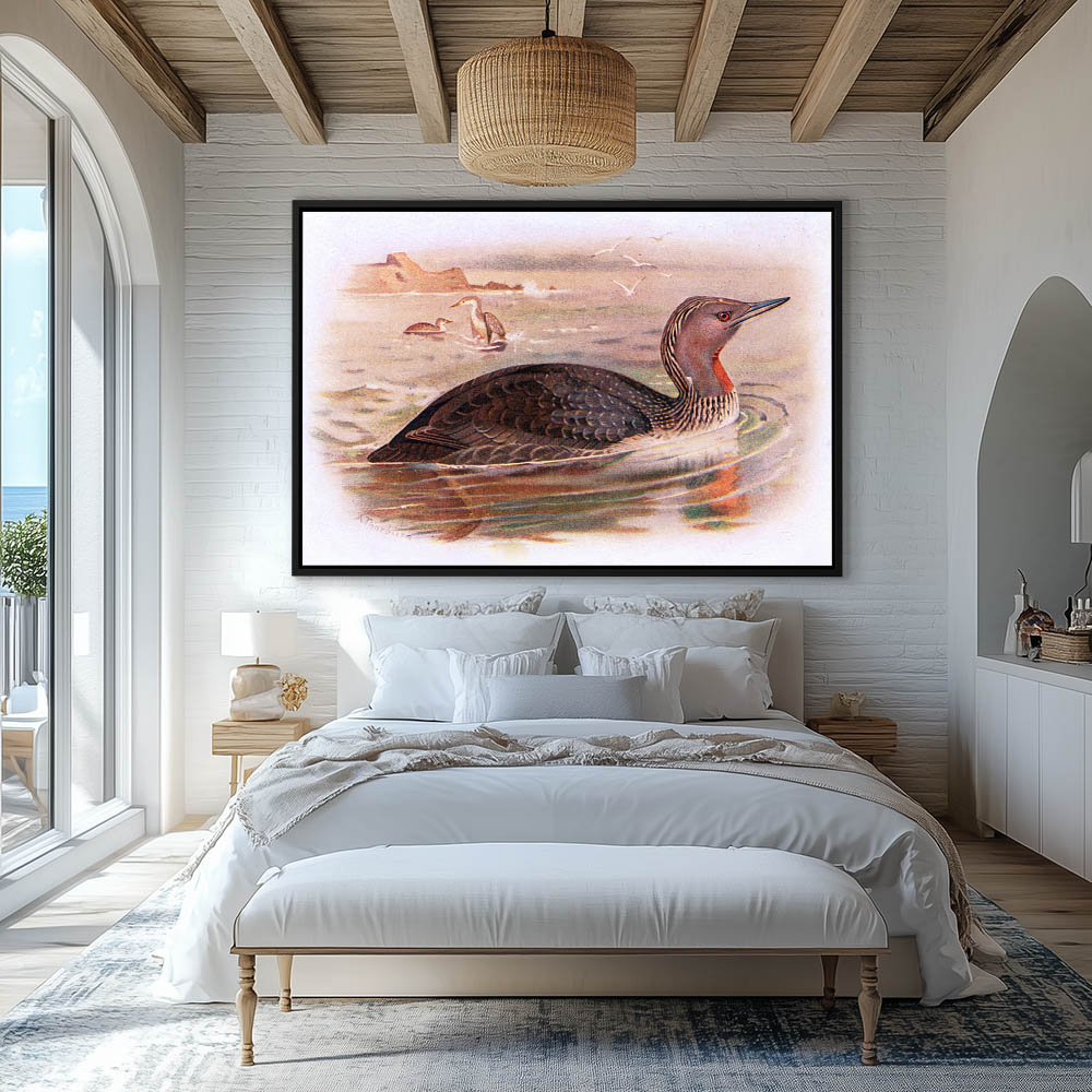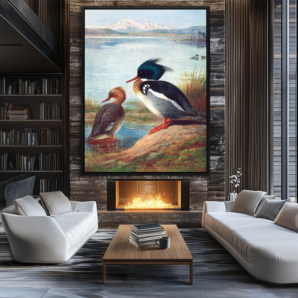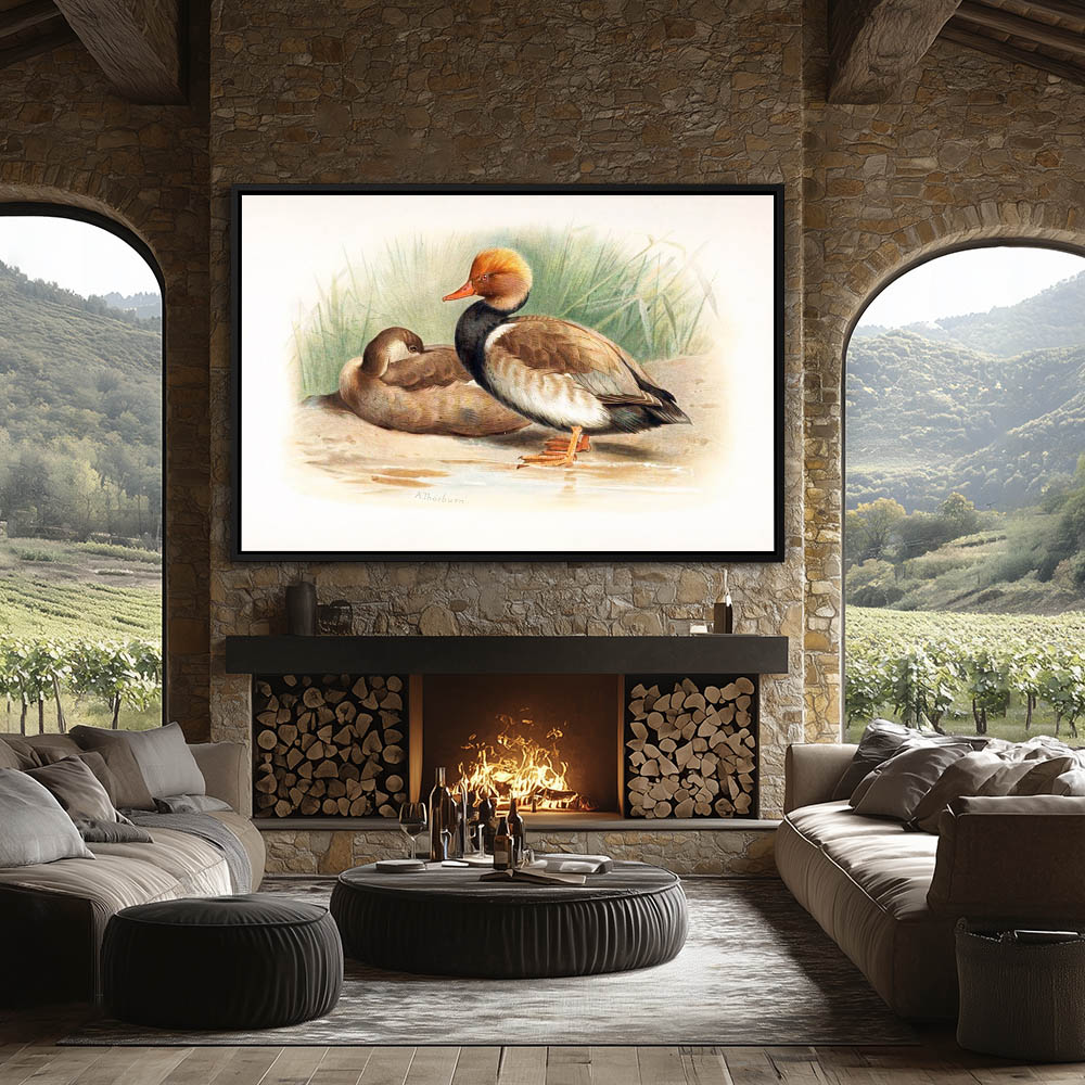 Painting of Red Crested Pochard Ducks on the Shore by the Edge of the Water