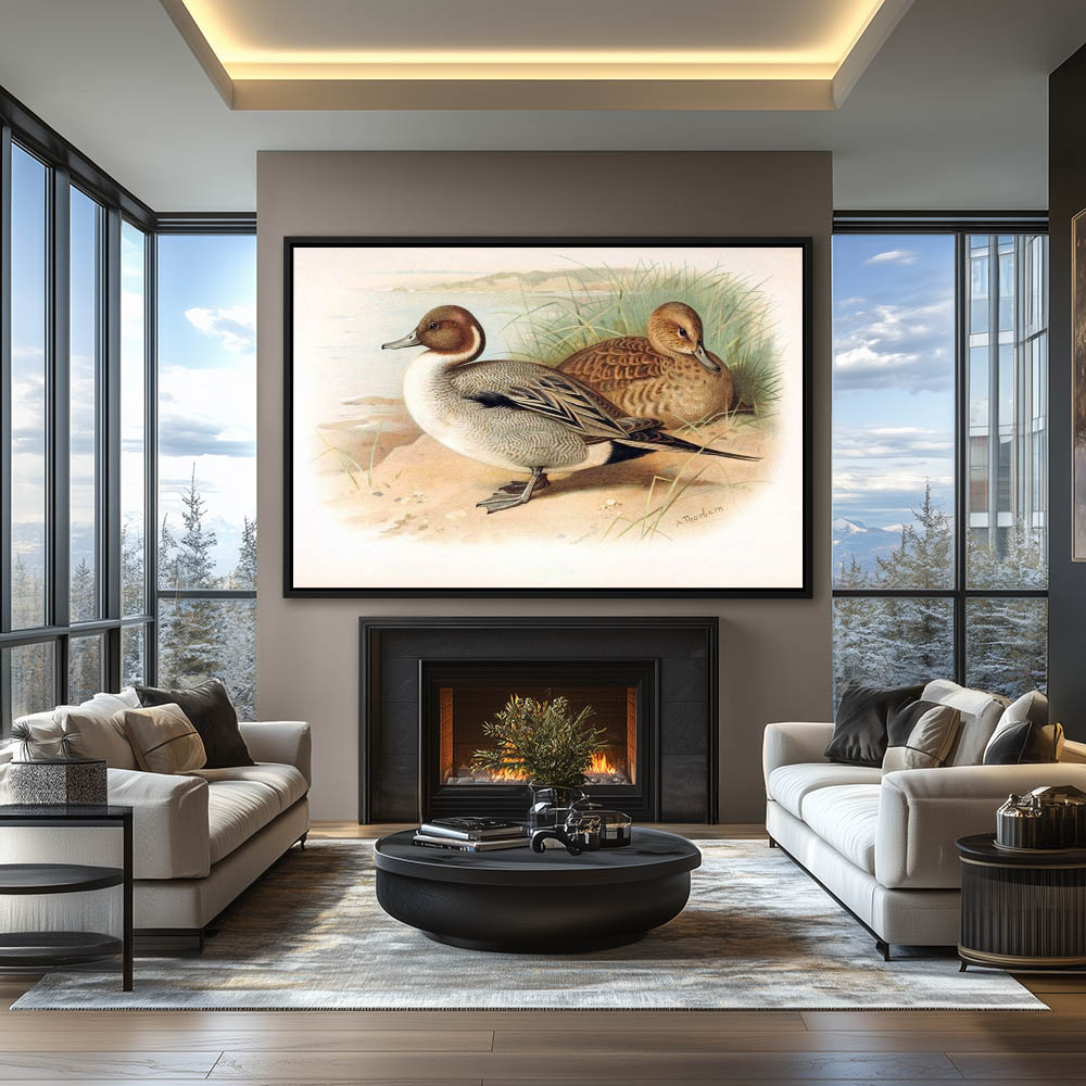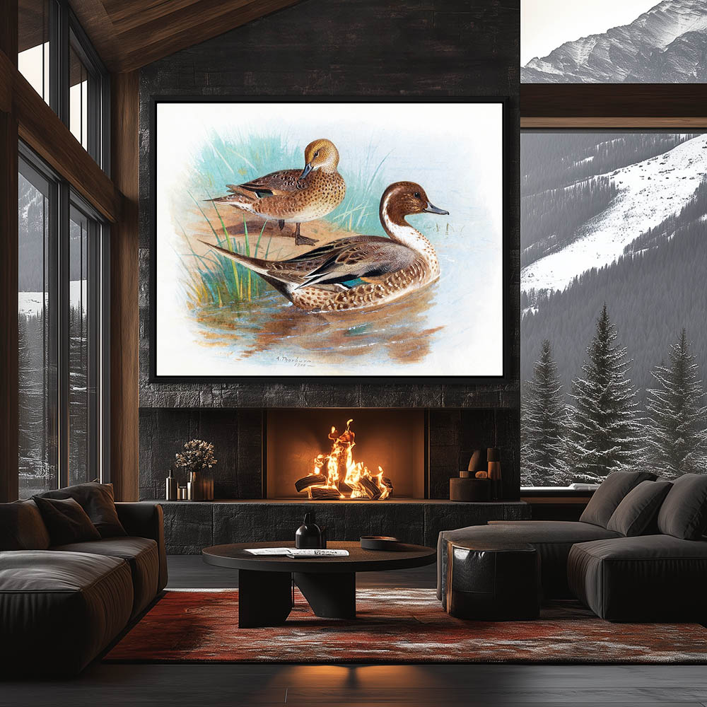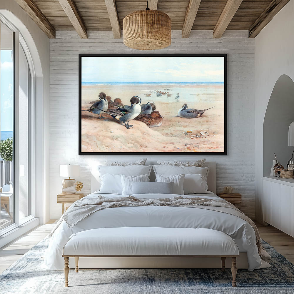 Painting of Pintail Ducks resting in the Sand Near the Grass