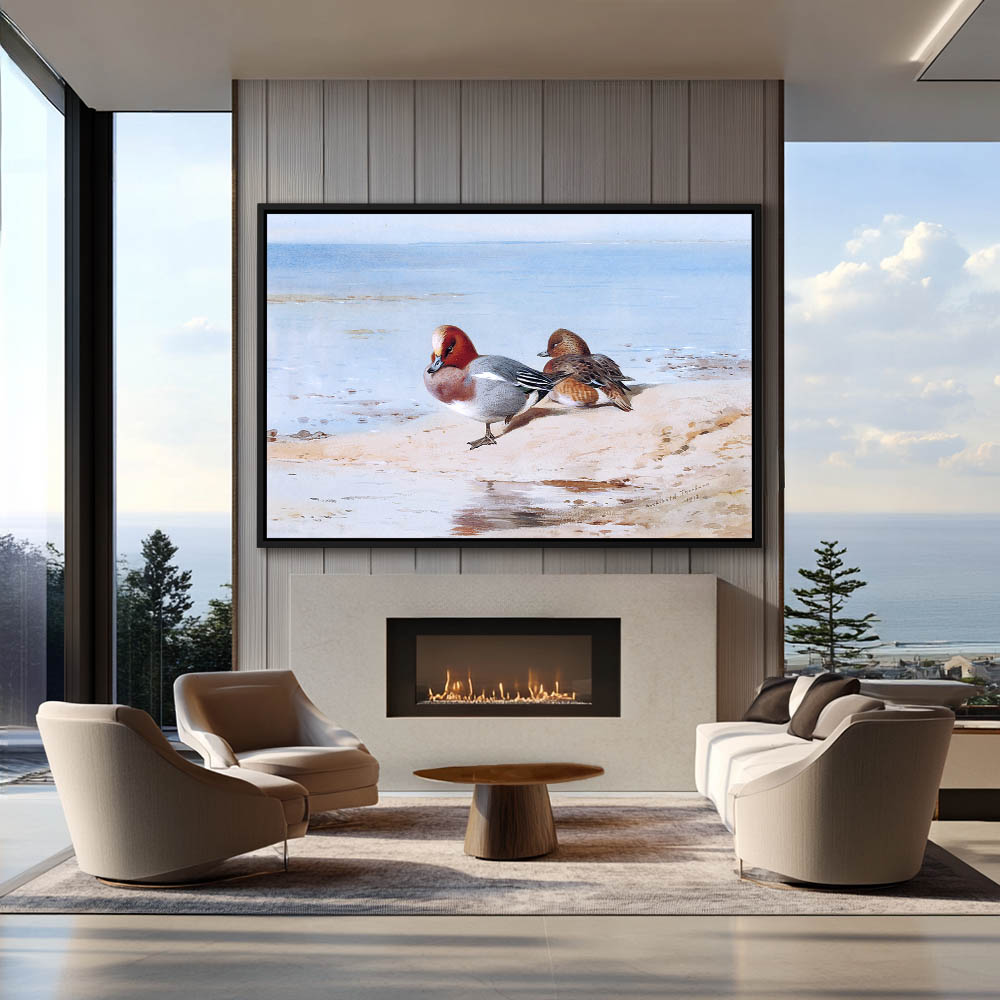 Painting of a Pair of Wigeon Ducks on Shore at the Waters Edge
