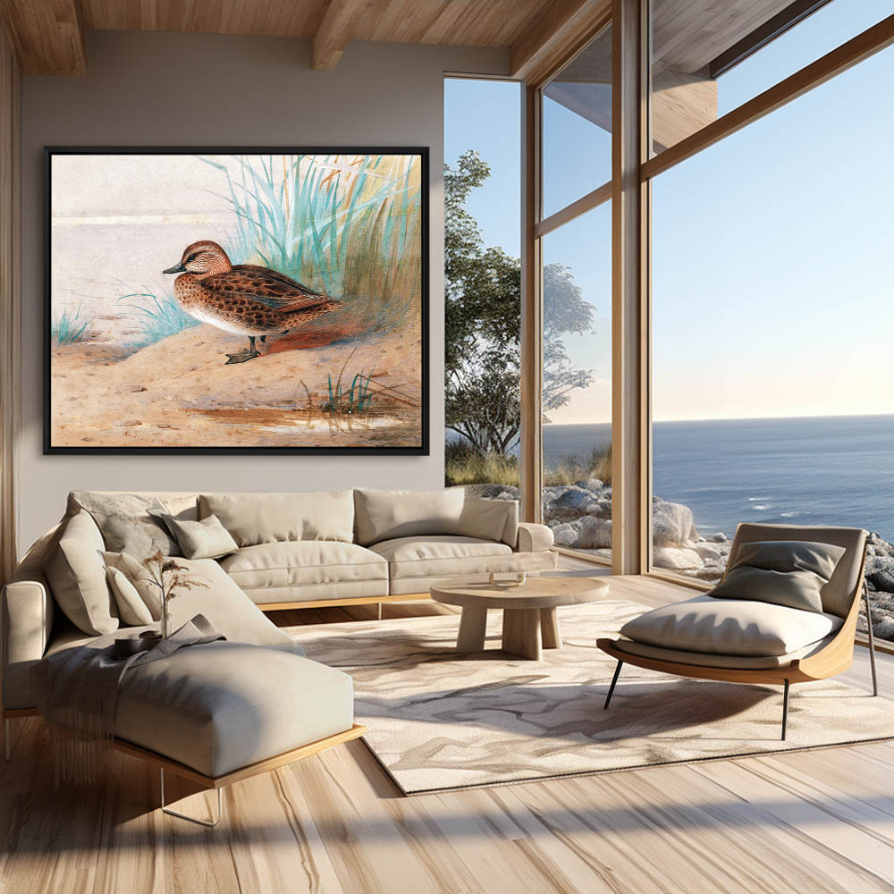 Painting of a Teal Duck Standing on the Shore Edge by the Reeds