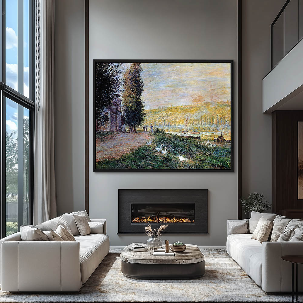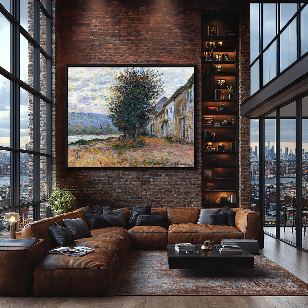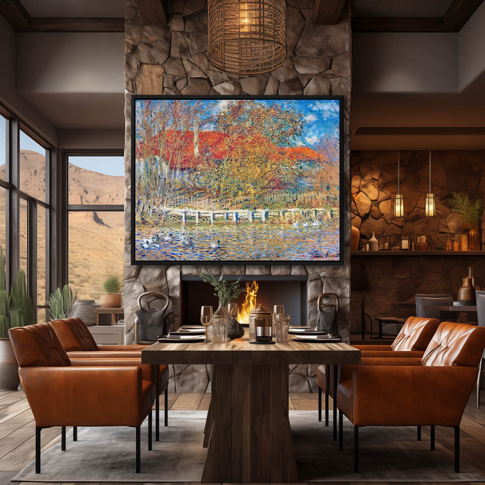 Vintage River Landscape Painting with Ducks and a Cottage