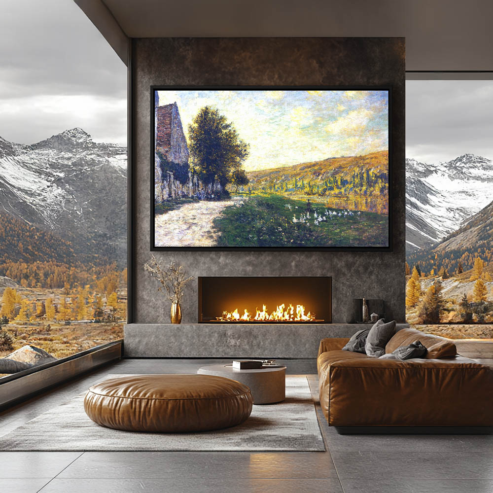 Vintage Landscape Painting with a Farmhouse and Ducks