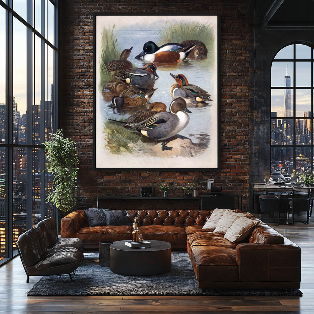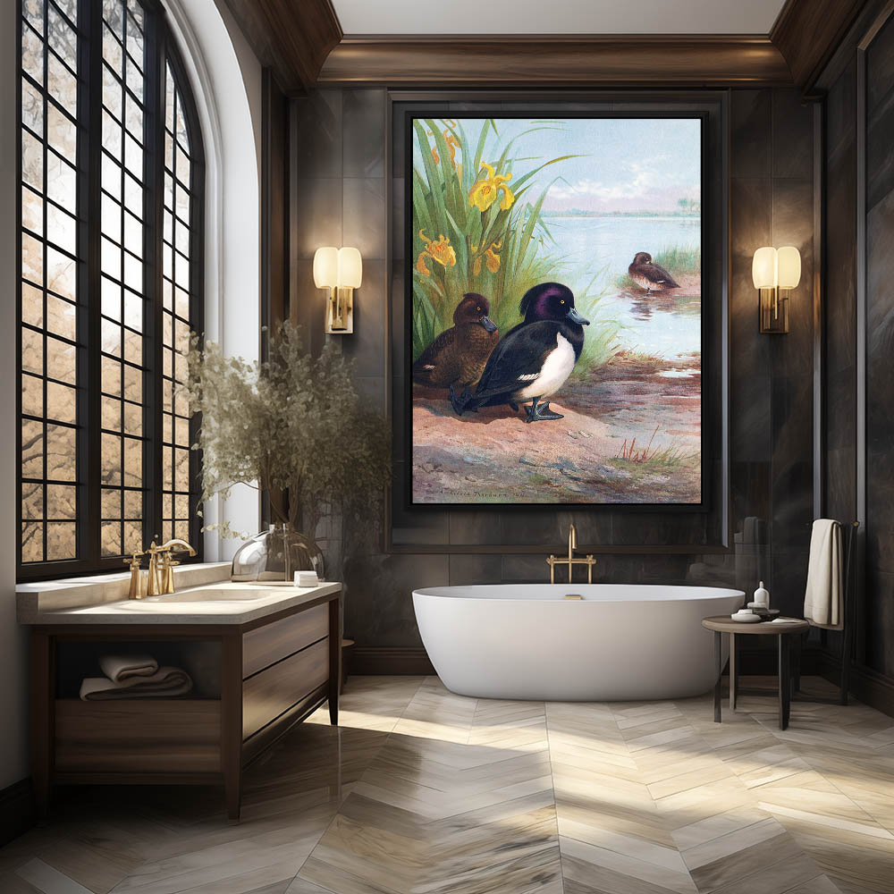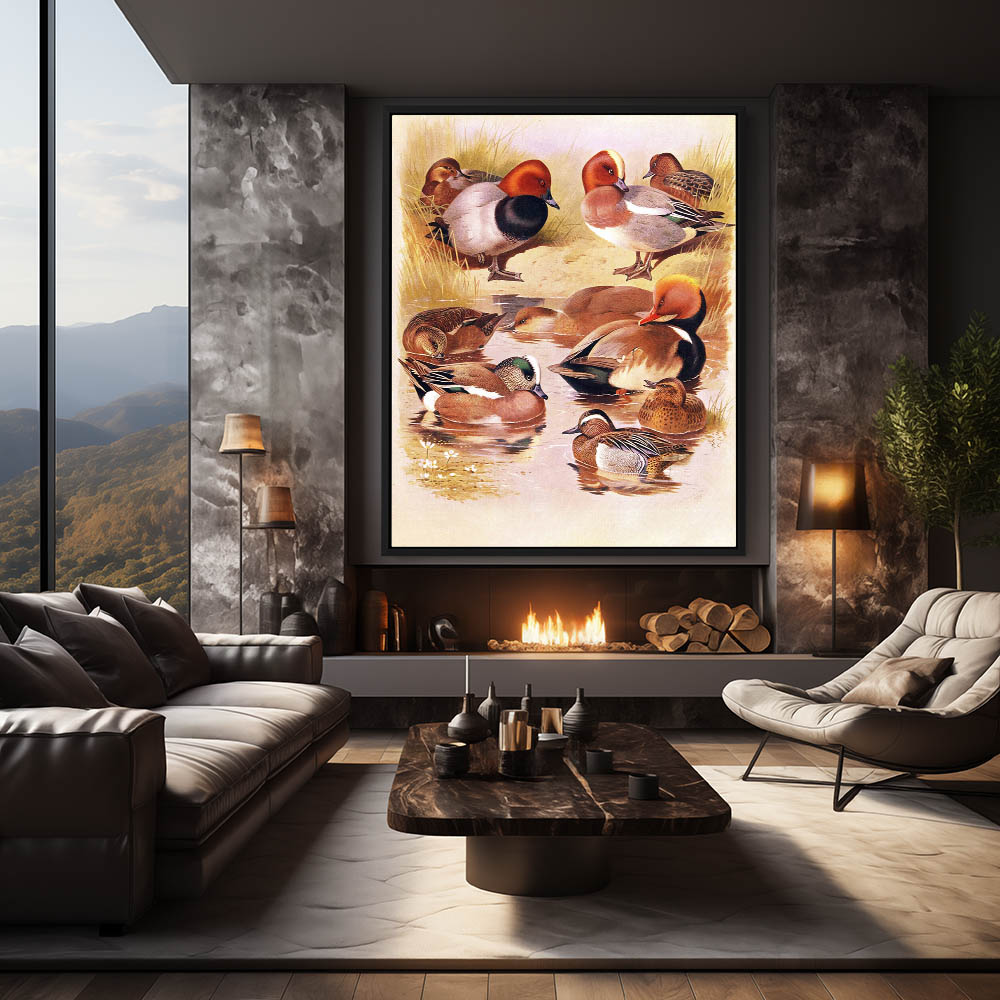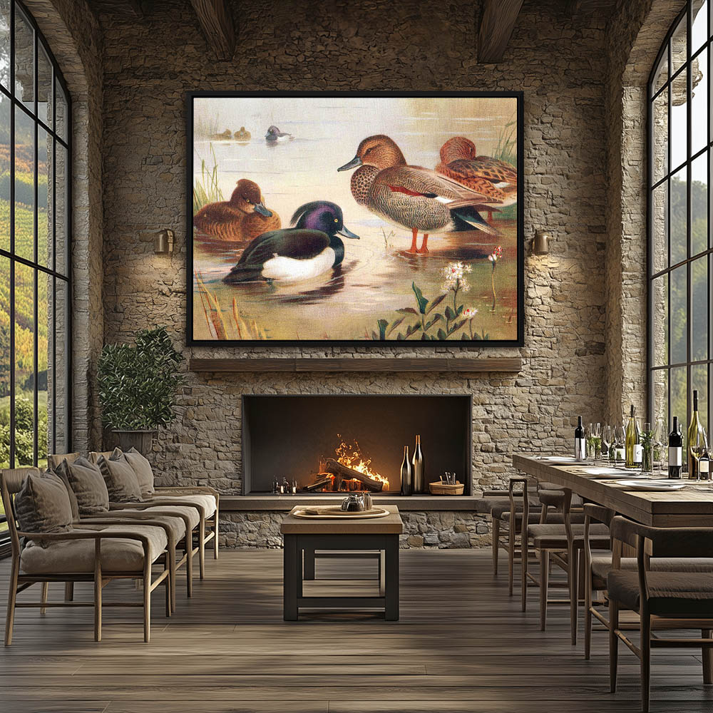 Painting of White Eyed Pochards Ducks in the Water Next to the Reeds