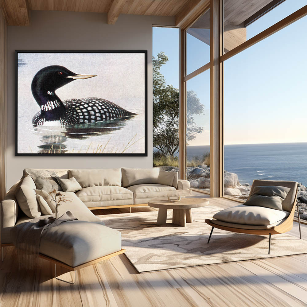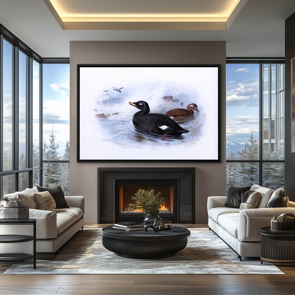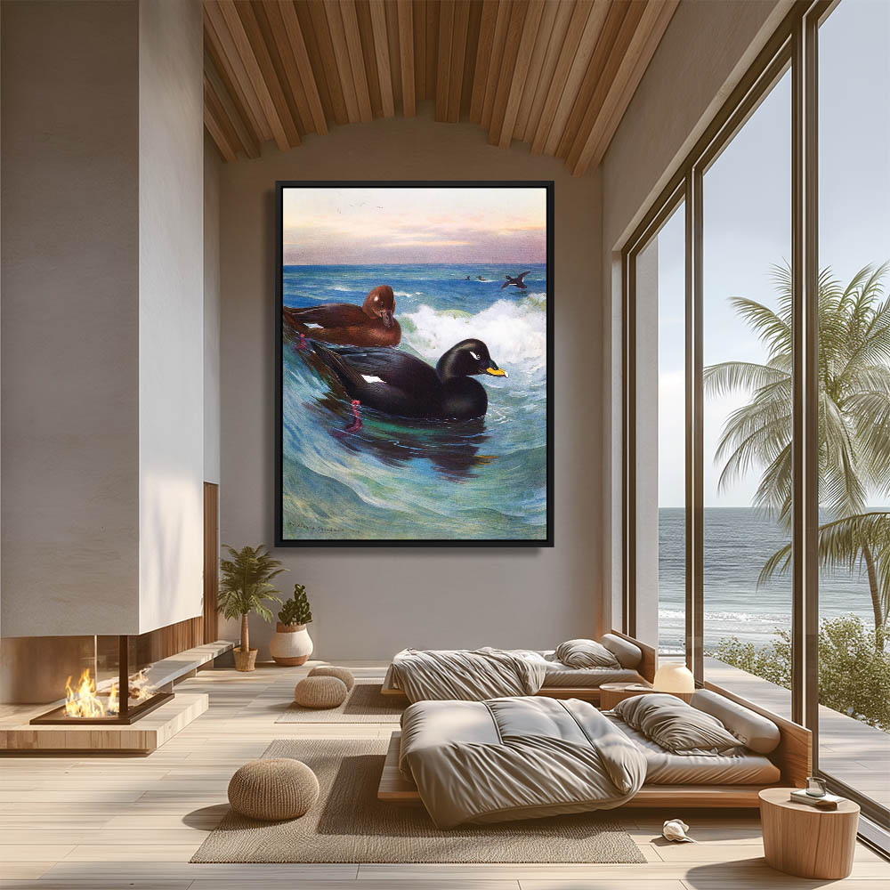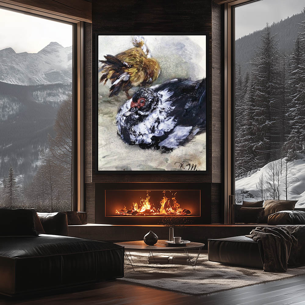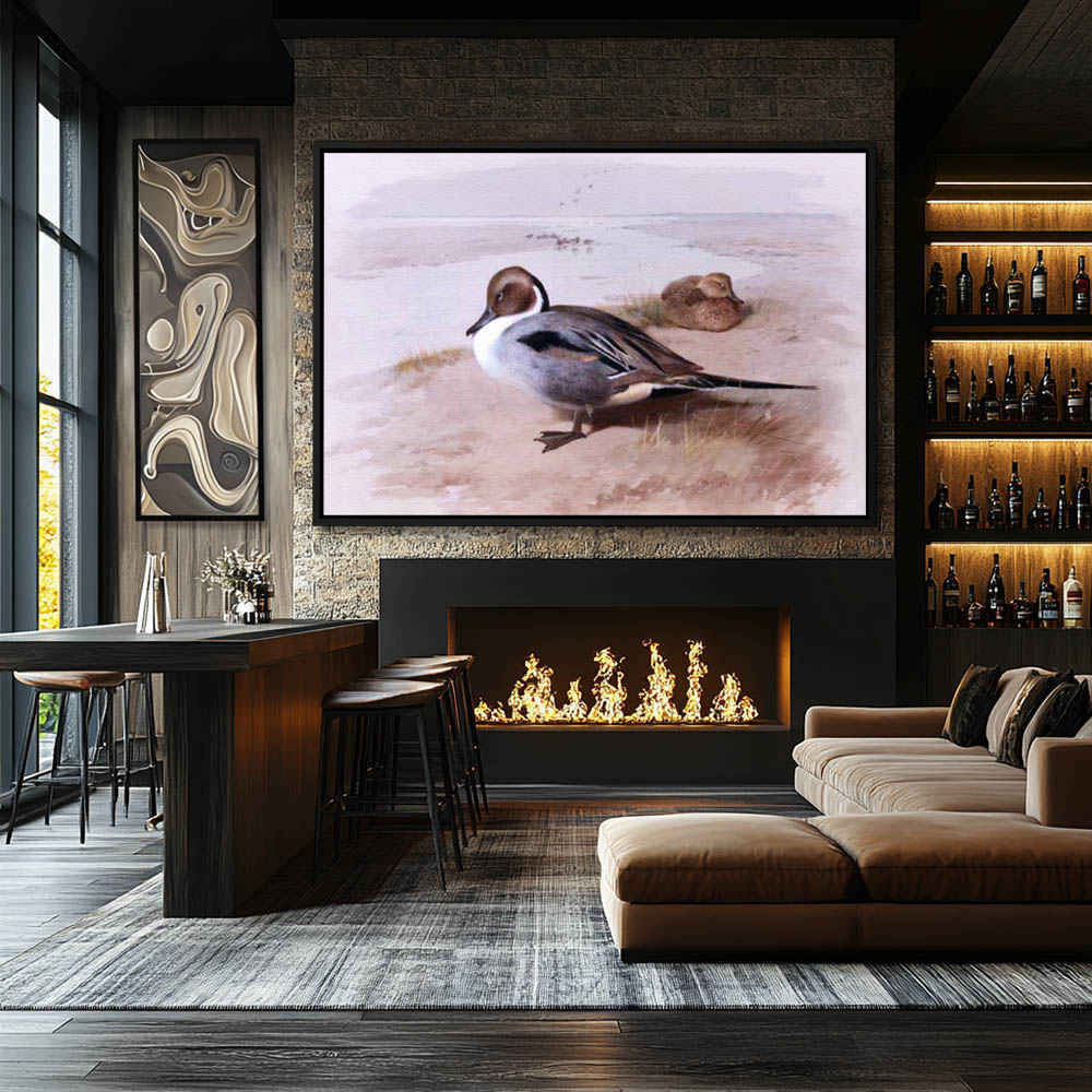 Painting of White Eyed Pochards Ducks in the Water Next to the Reeds