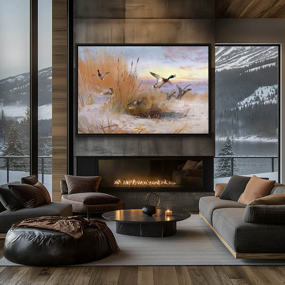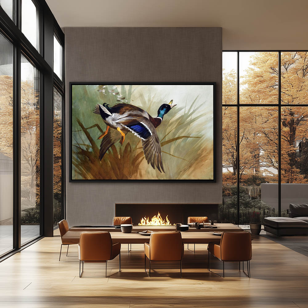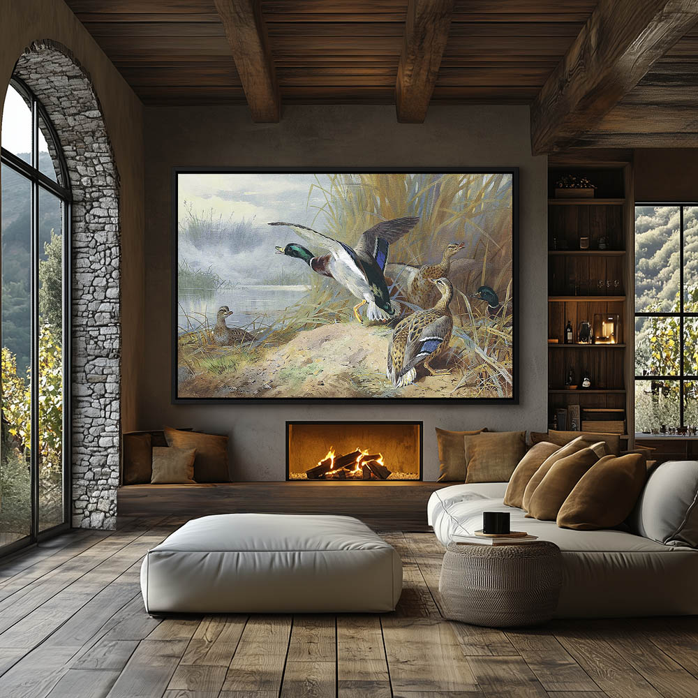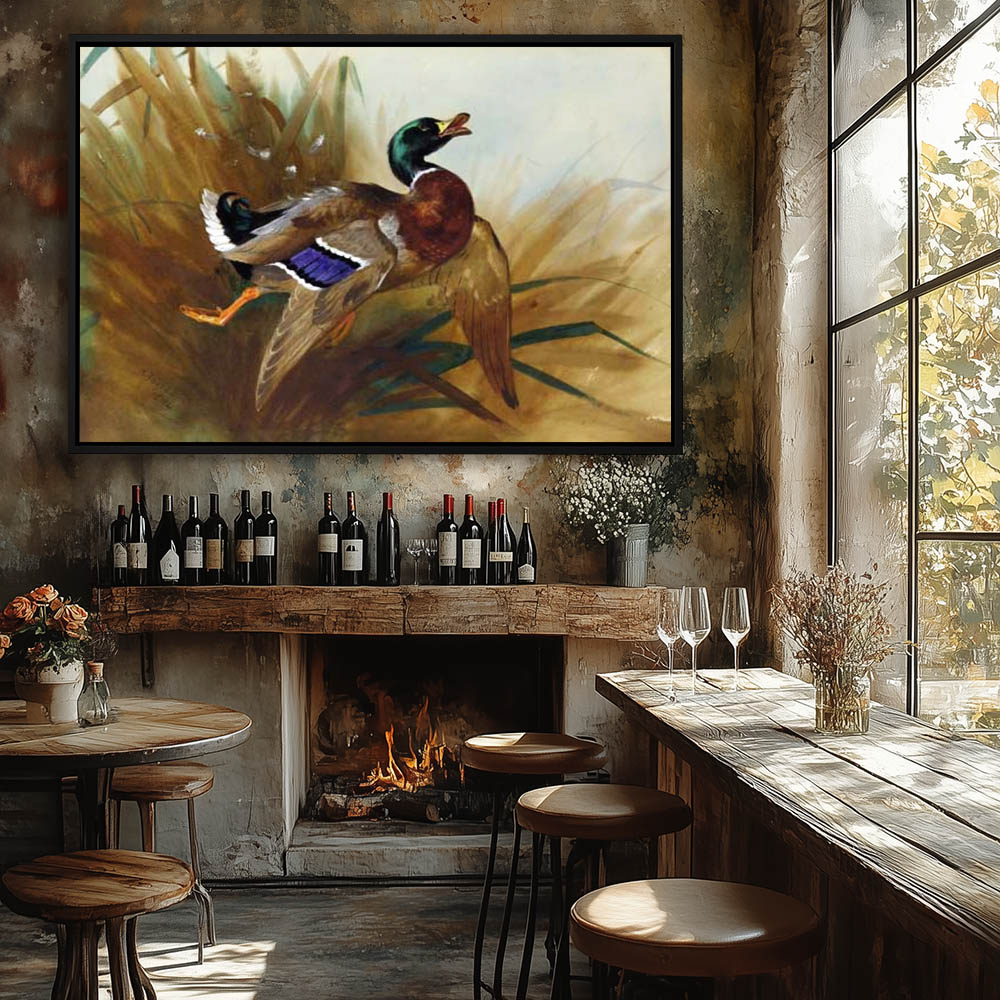 Painting of Mallards Taking Flight from a Fox in the Reeds