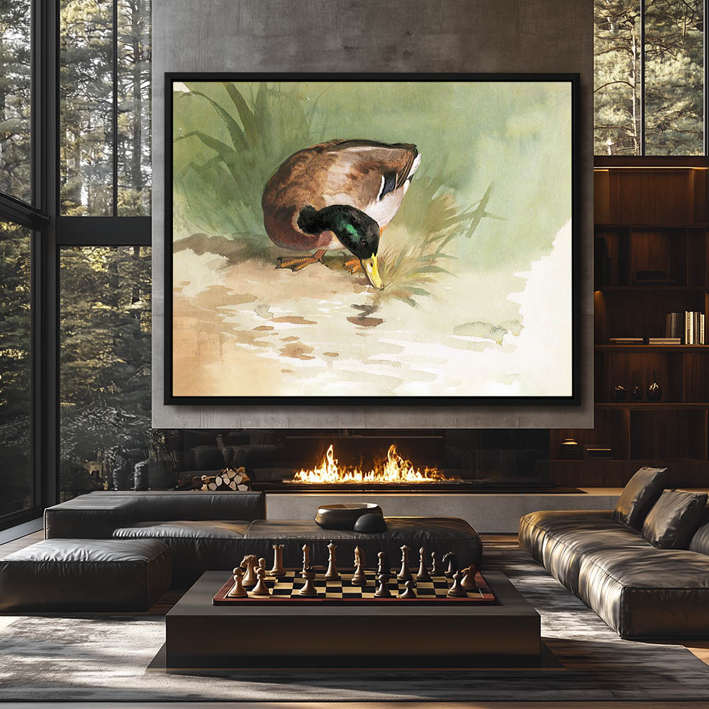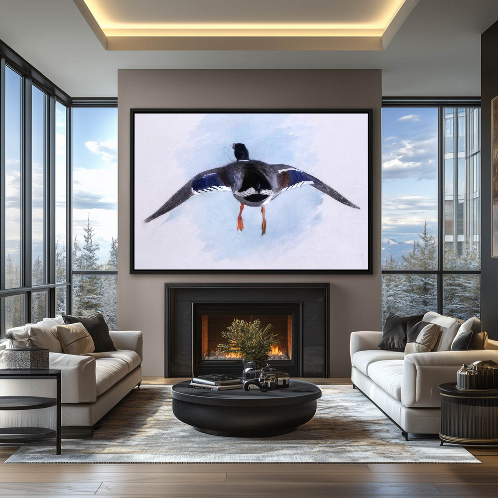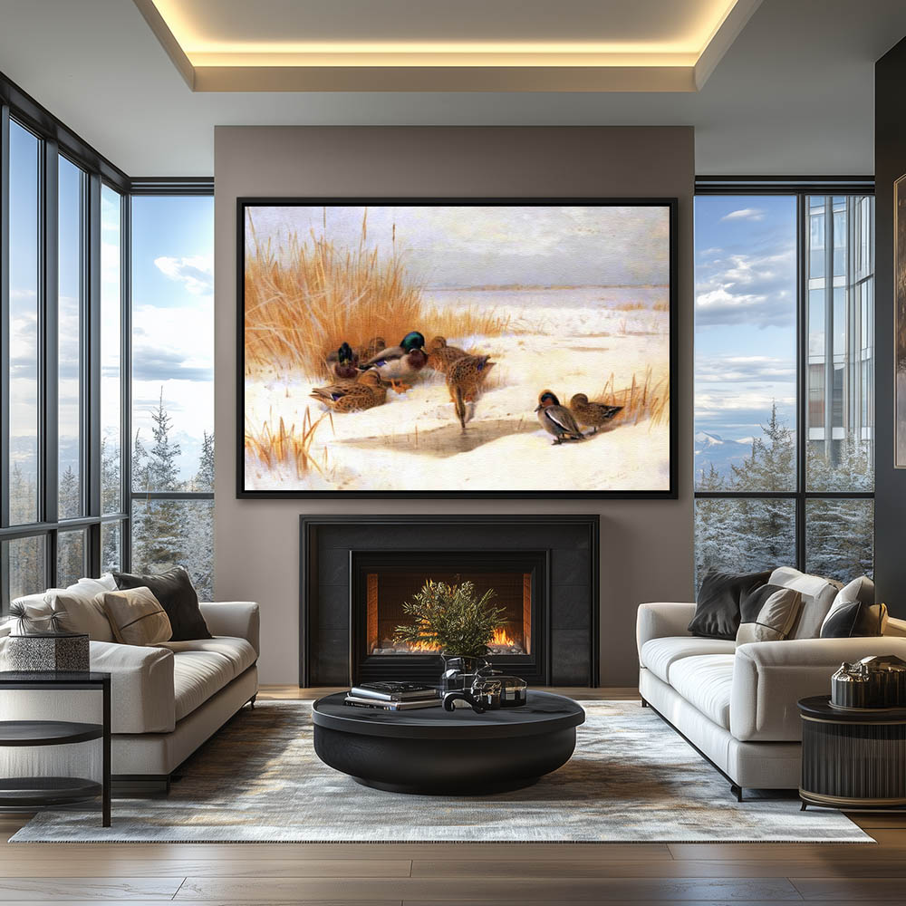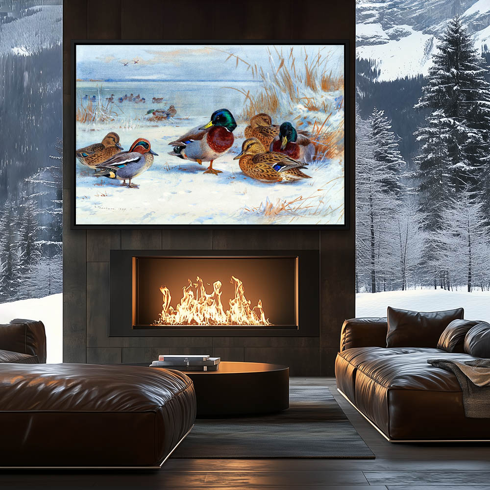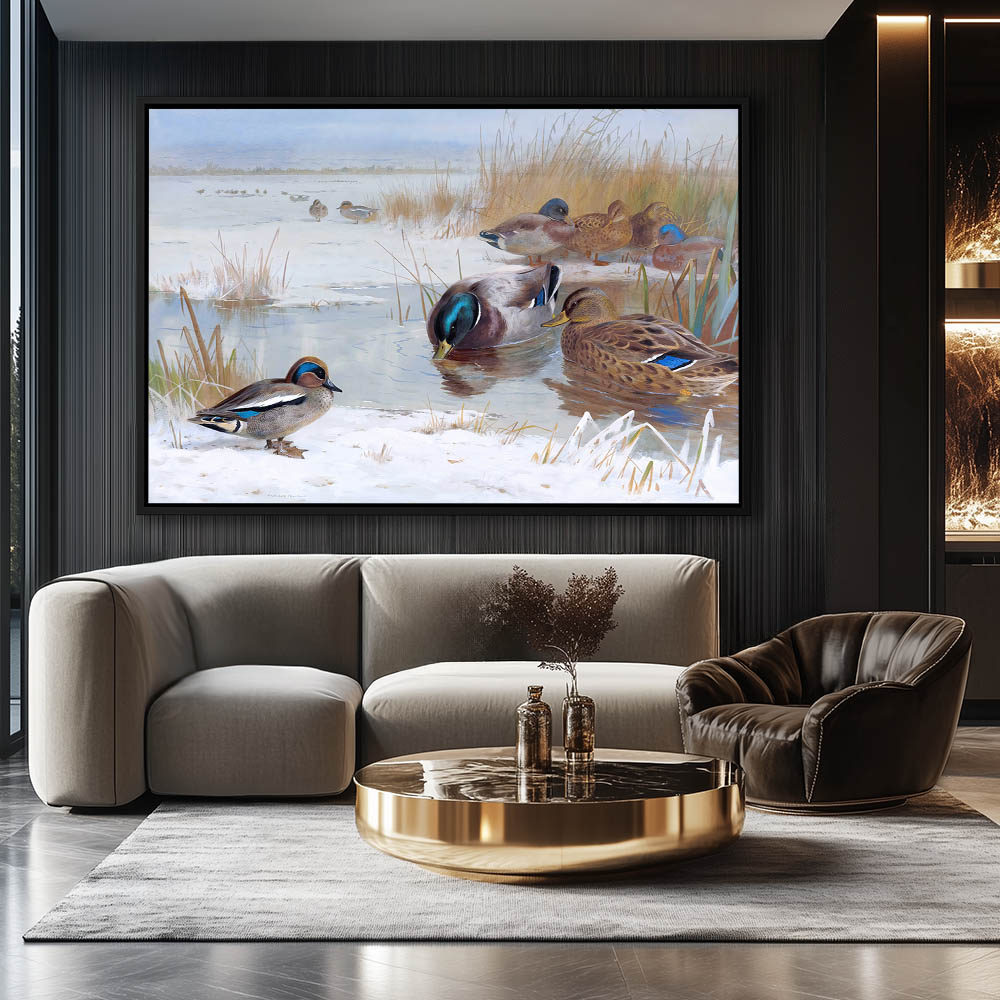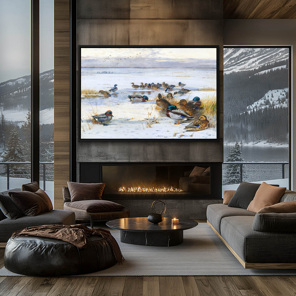 Snowy Marsh Landscape Painting with Mallard and Teal Ducks on the Snow