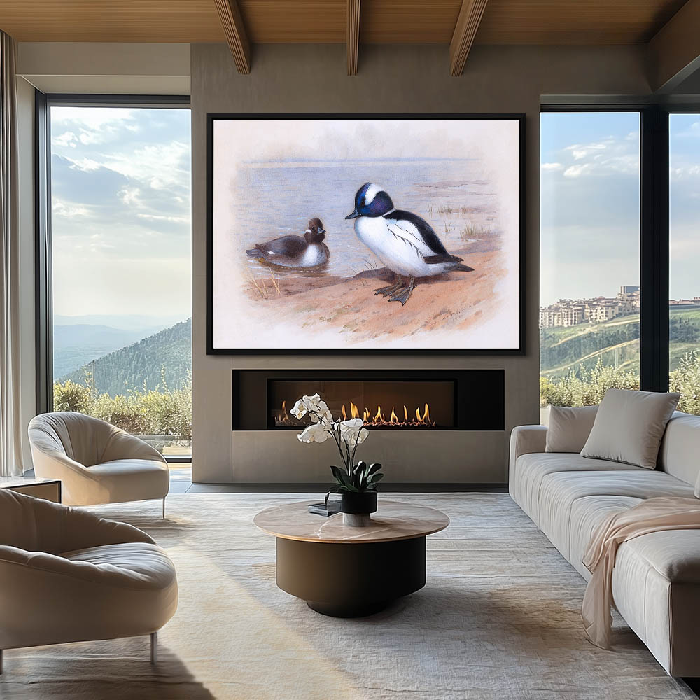Winter Frozen Landscape Painting with Ducks Resting on the Ice and Water