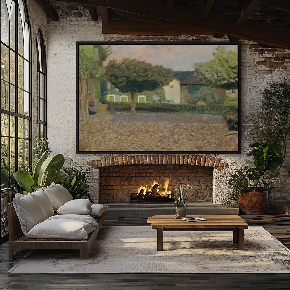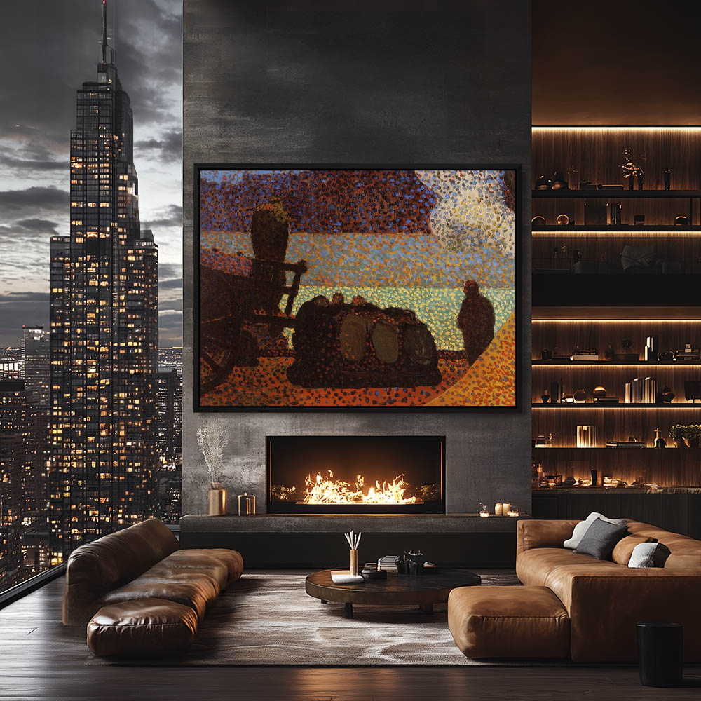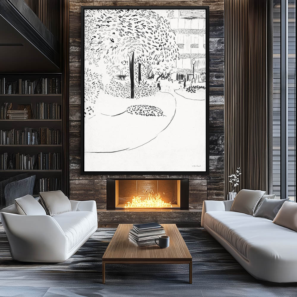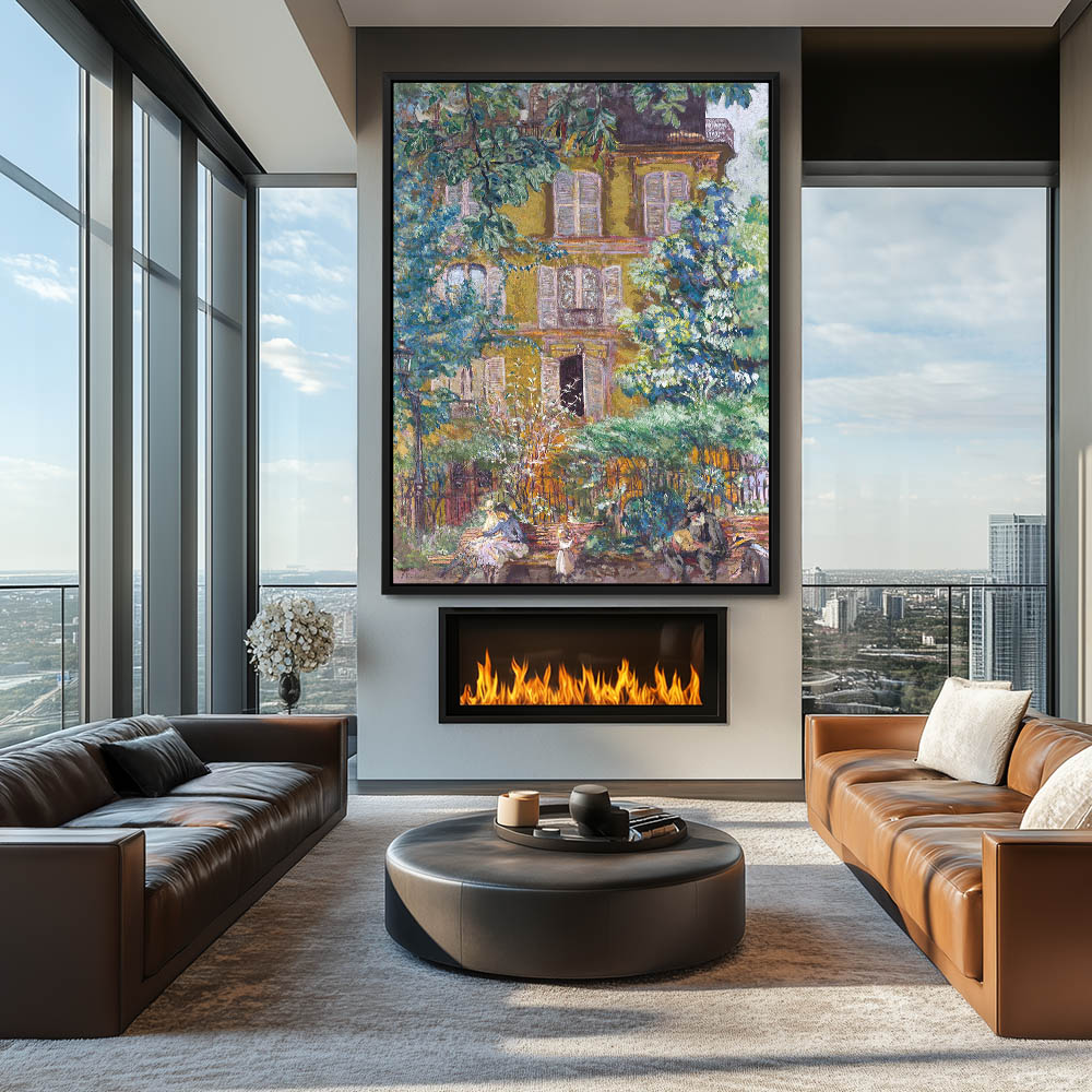 From $29.97Abstract cityscape with people sitting on benches in front of a house