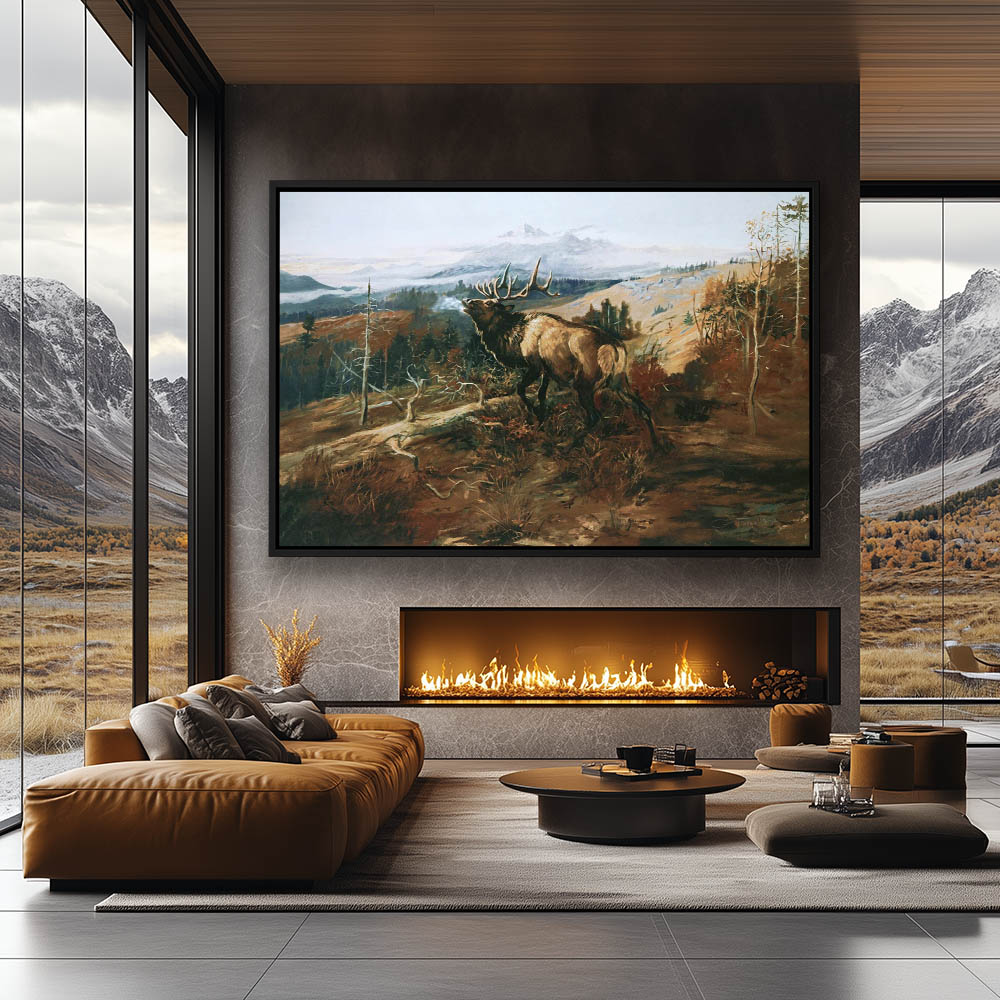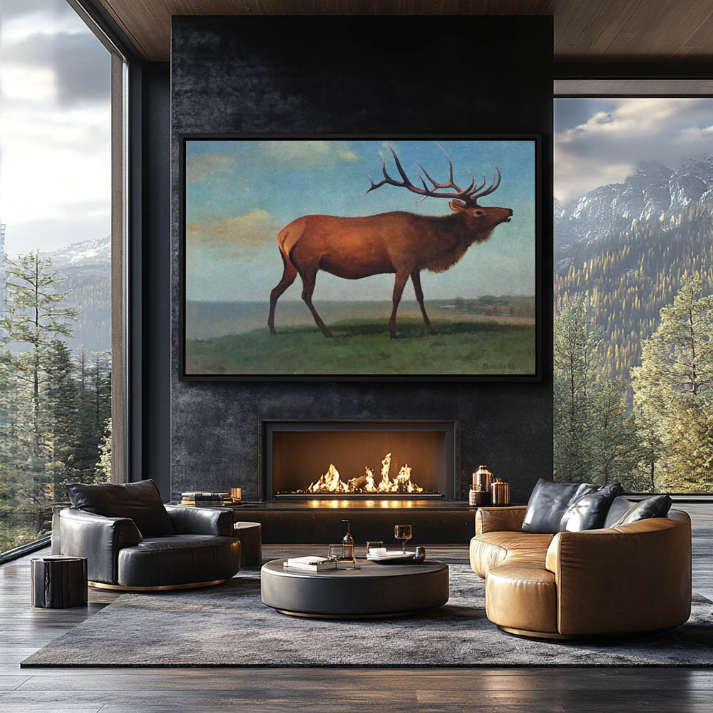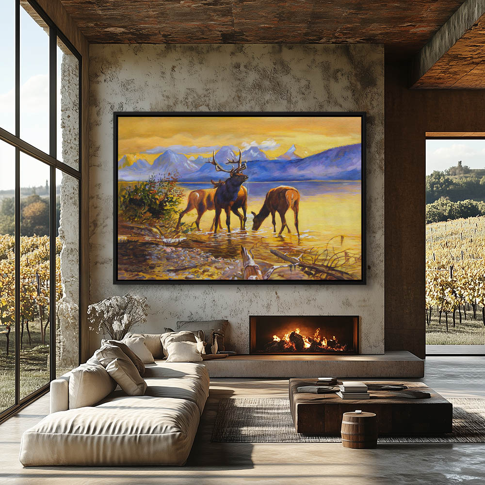 Wall Art Painting of an Elk at Sunset for Home Decor or Cabin Decor, Metal Wall Art, Stretched Canvas, Poster Art, Framed Wall Art, Fine Art Prints, Vinyl Wall Peel, Canvas Wall Art framed with Floater Frames
