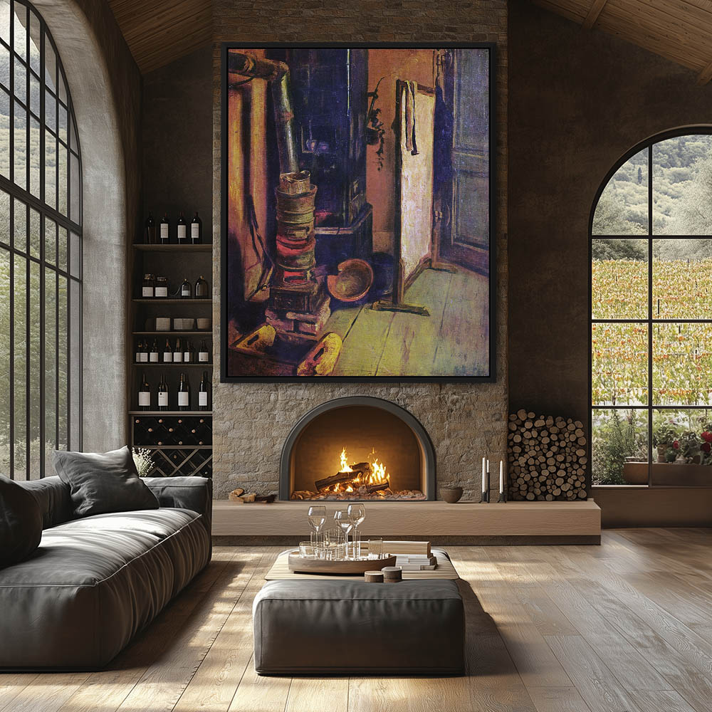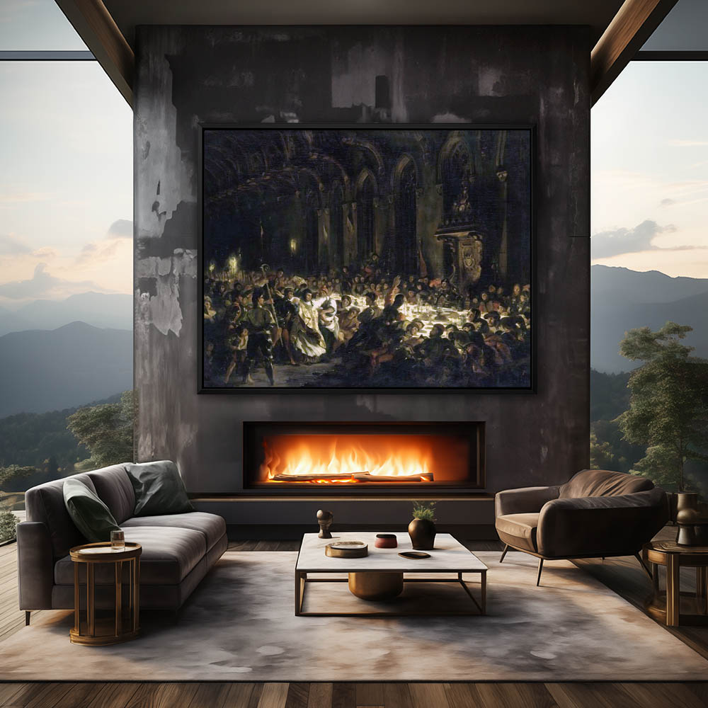 Vintage Figurative Painting with a Large Group of People around a Table in an Interior