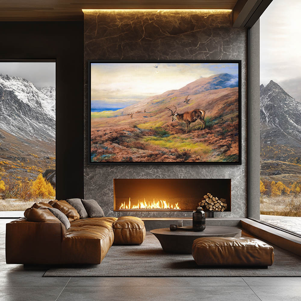 Mountain Landscape Painting with Deer and Falcons Flying