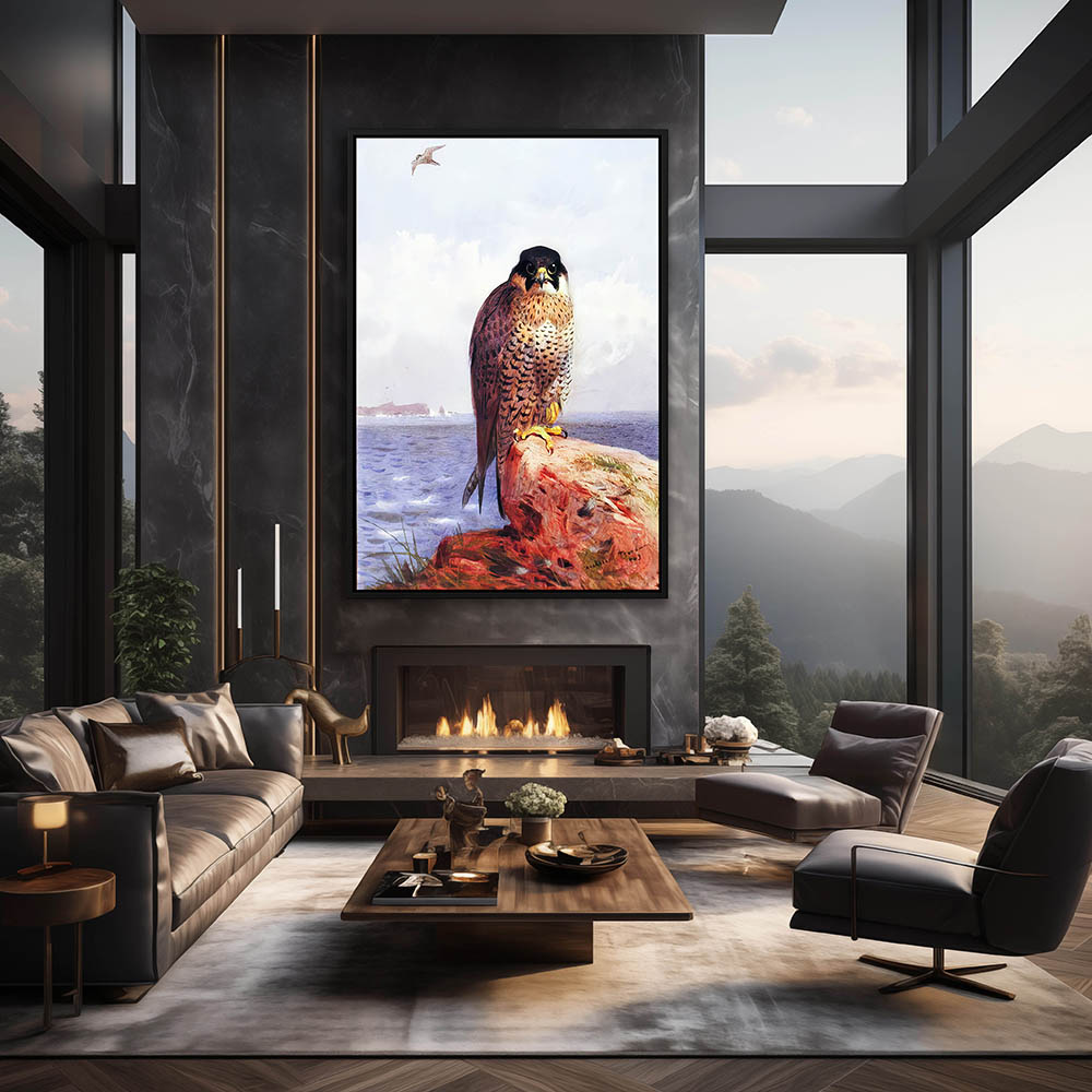 Painting of a Falcon Bird of Prey Perched on a Rock Overlooking the Sea