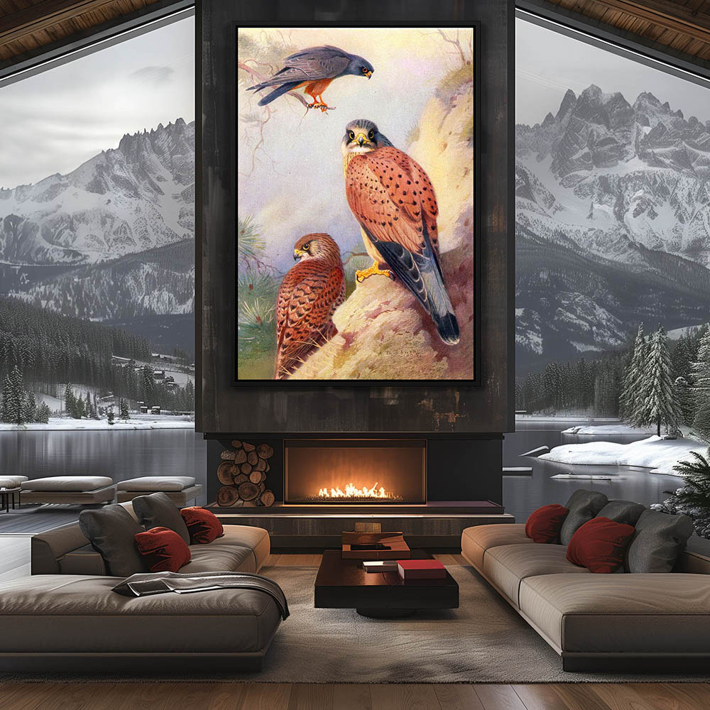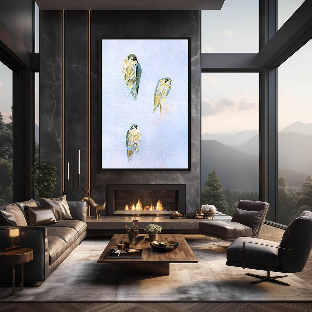 Painting of Three Falcons with Two Resting on a Rock and one on a Limb