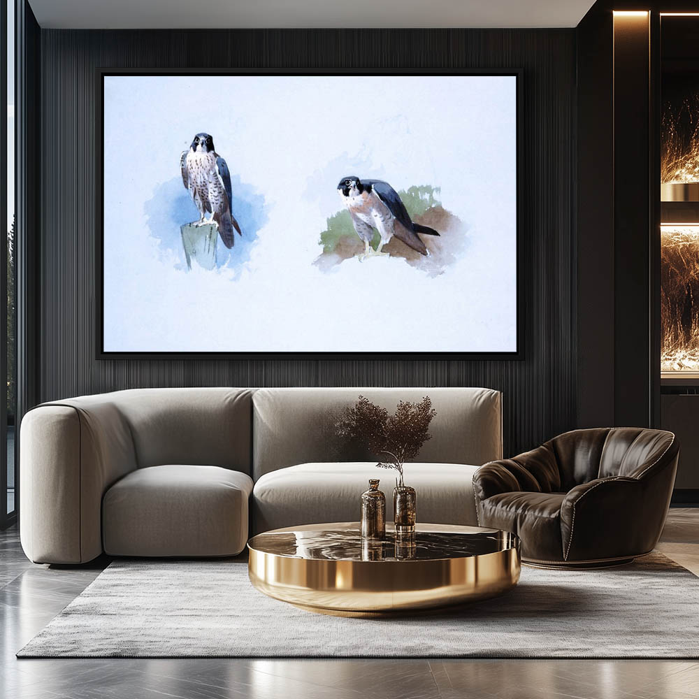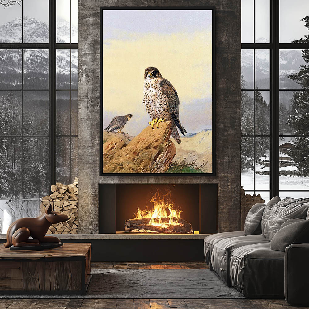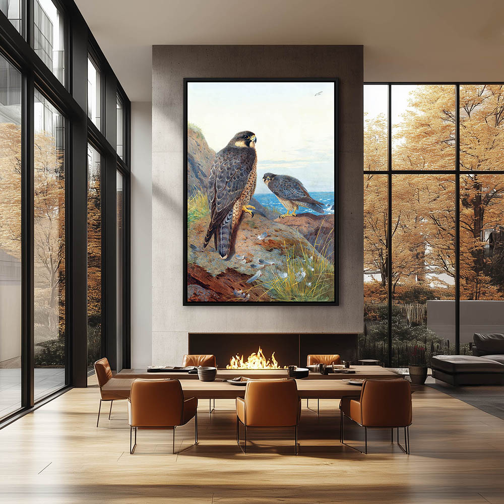 Painting of Peregrine Falcons Perched on the Rocks Overlooking the Sea
