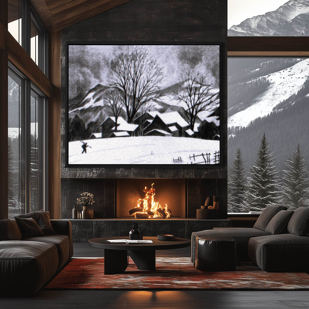 Landscape Painting in Winter with Snow and a Figure Walking Home in Black and White