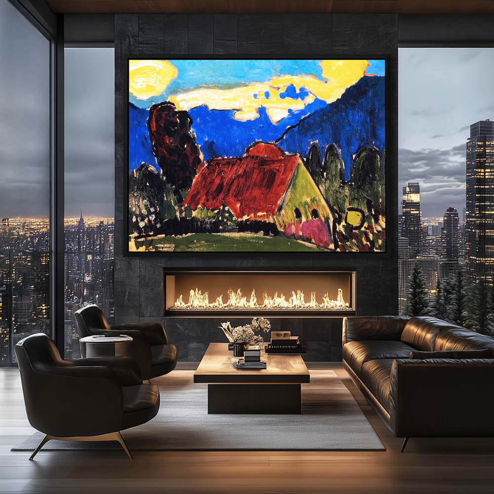 Abstract Landscape Painting with House Trees and Mountains in the Distance