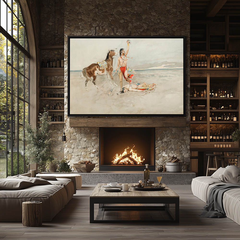 Aftermath of an Indian fight where the victor holds high the scalp of the loser