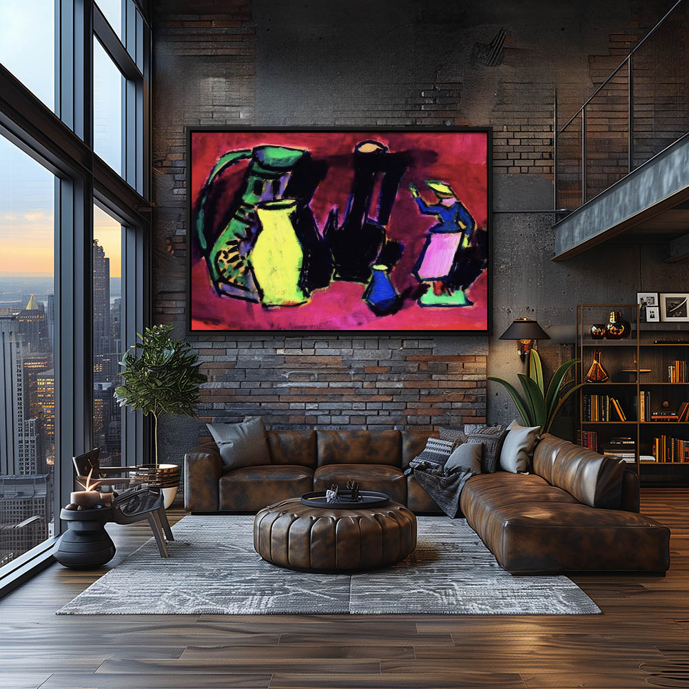 Abstract Still Life Painting with Pots and Figurines and Bright Colors
