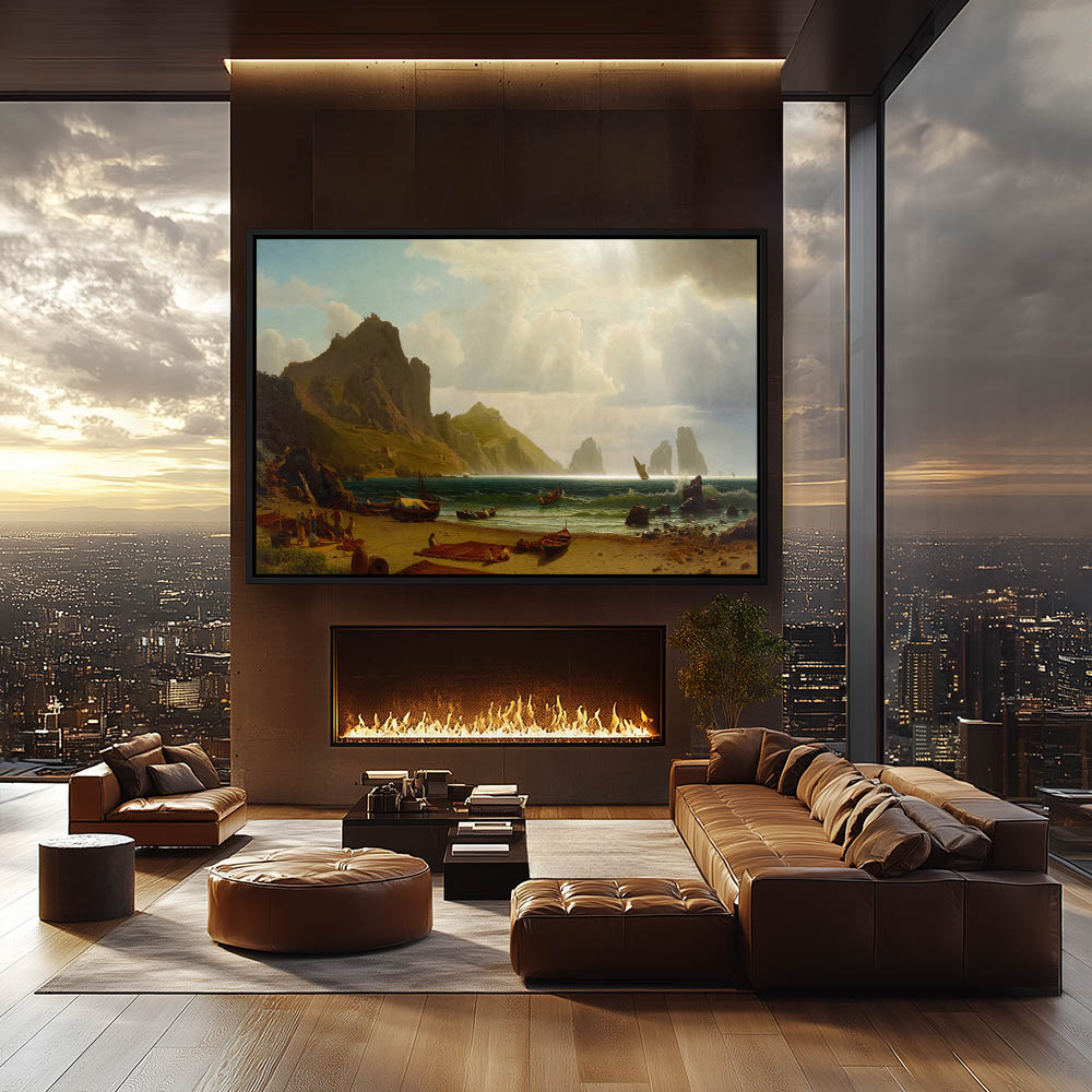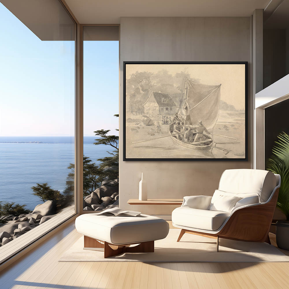 Danish Fishermen coming ashore with family waiting to greet them on the beach, A boy and dog wade out into the water