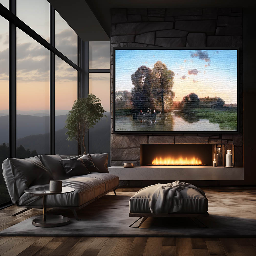 Landscape Painting with Figures Fishing on a Pond
