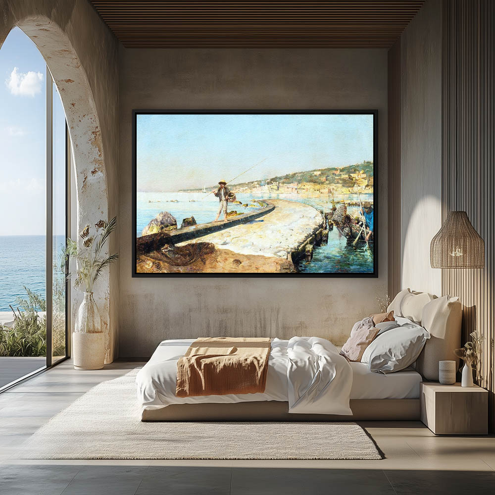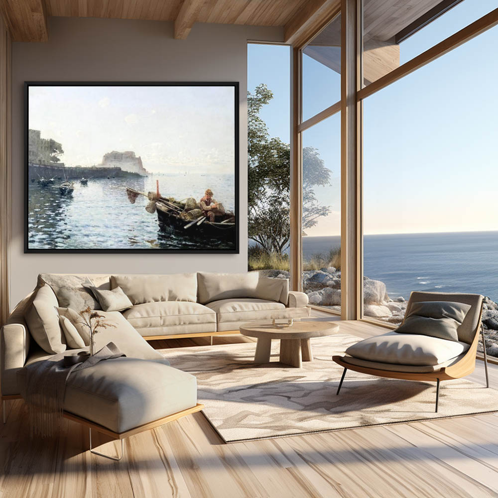 Coastal Painting with Figures Fishing in Boats at Sunset