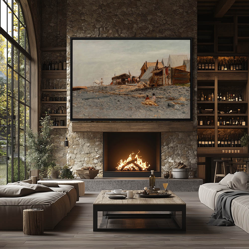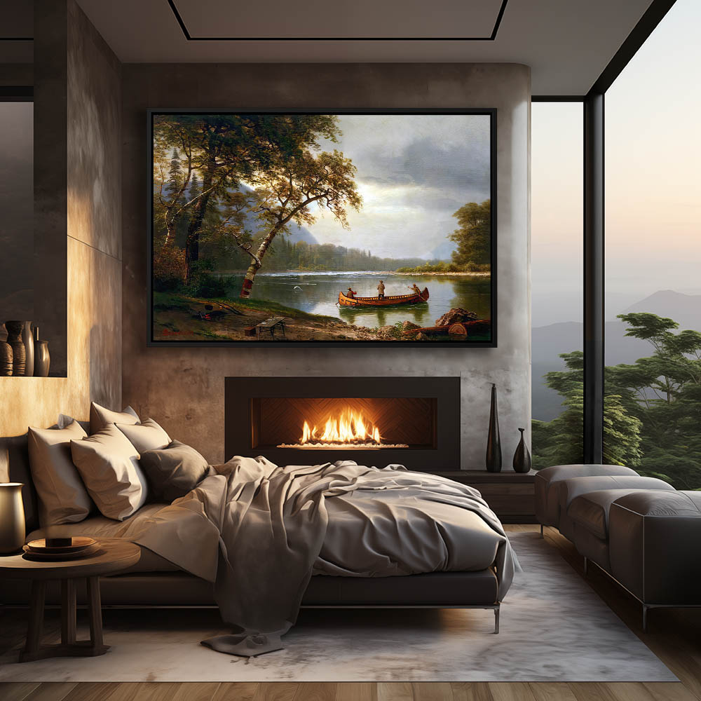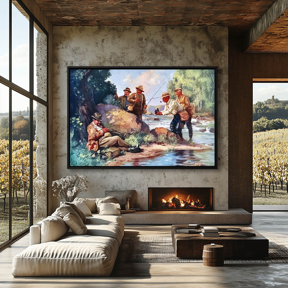 Landscape Painting of a Cabin with Figures Fishing in a Creek