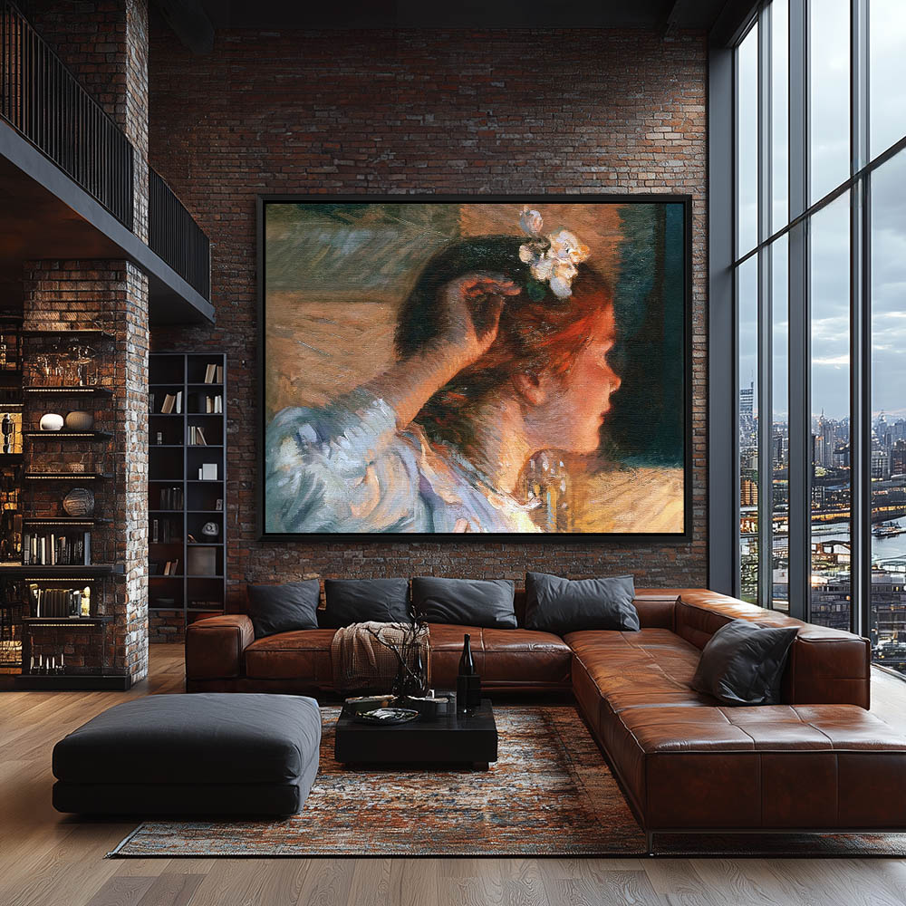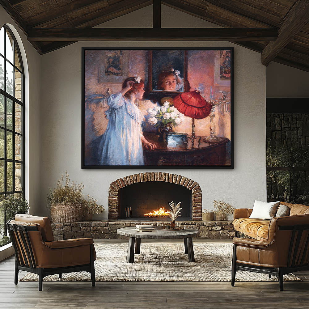 Figurative Painting of a Young Girl Looking in a Mirror with Flower in her Hair