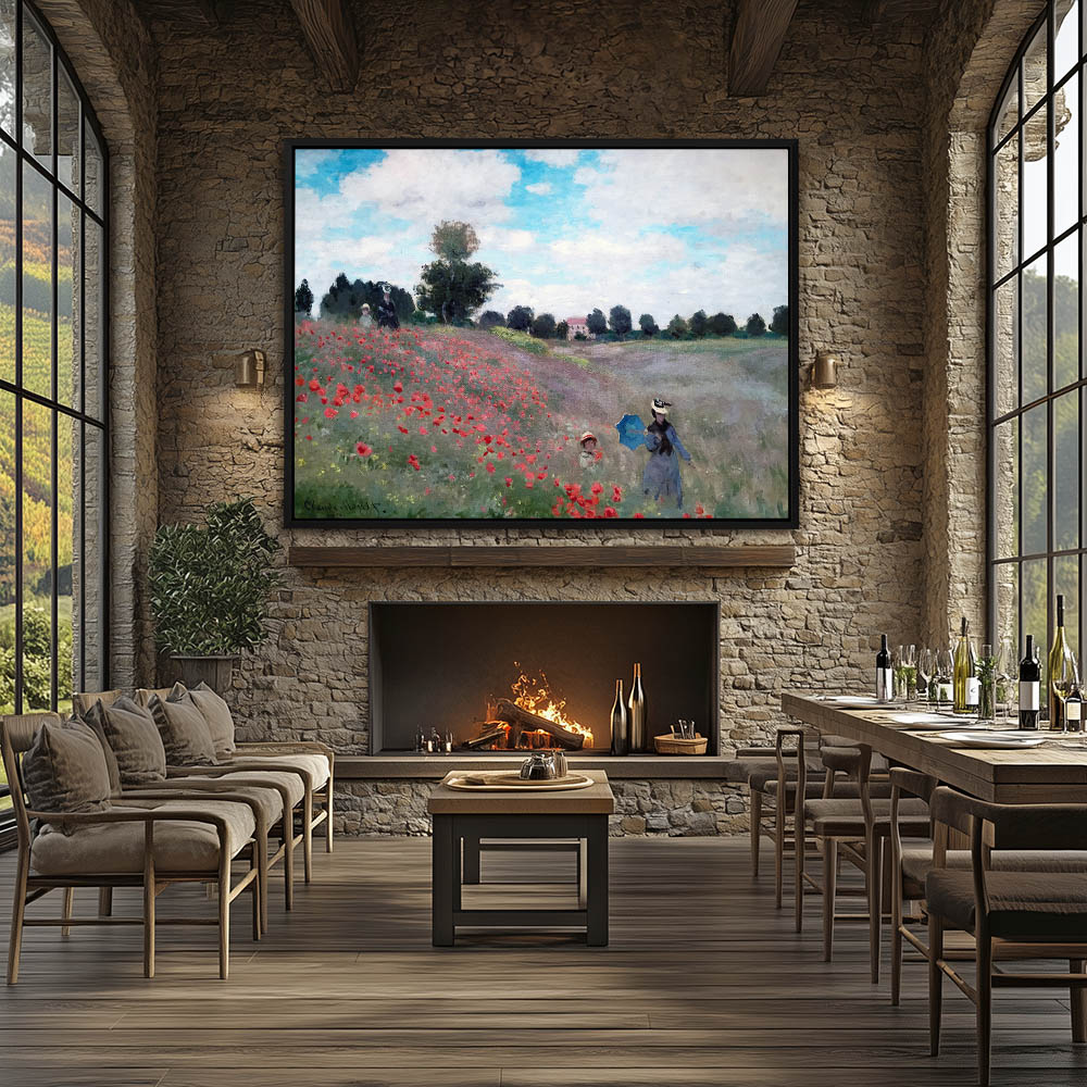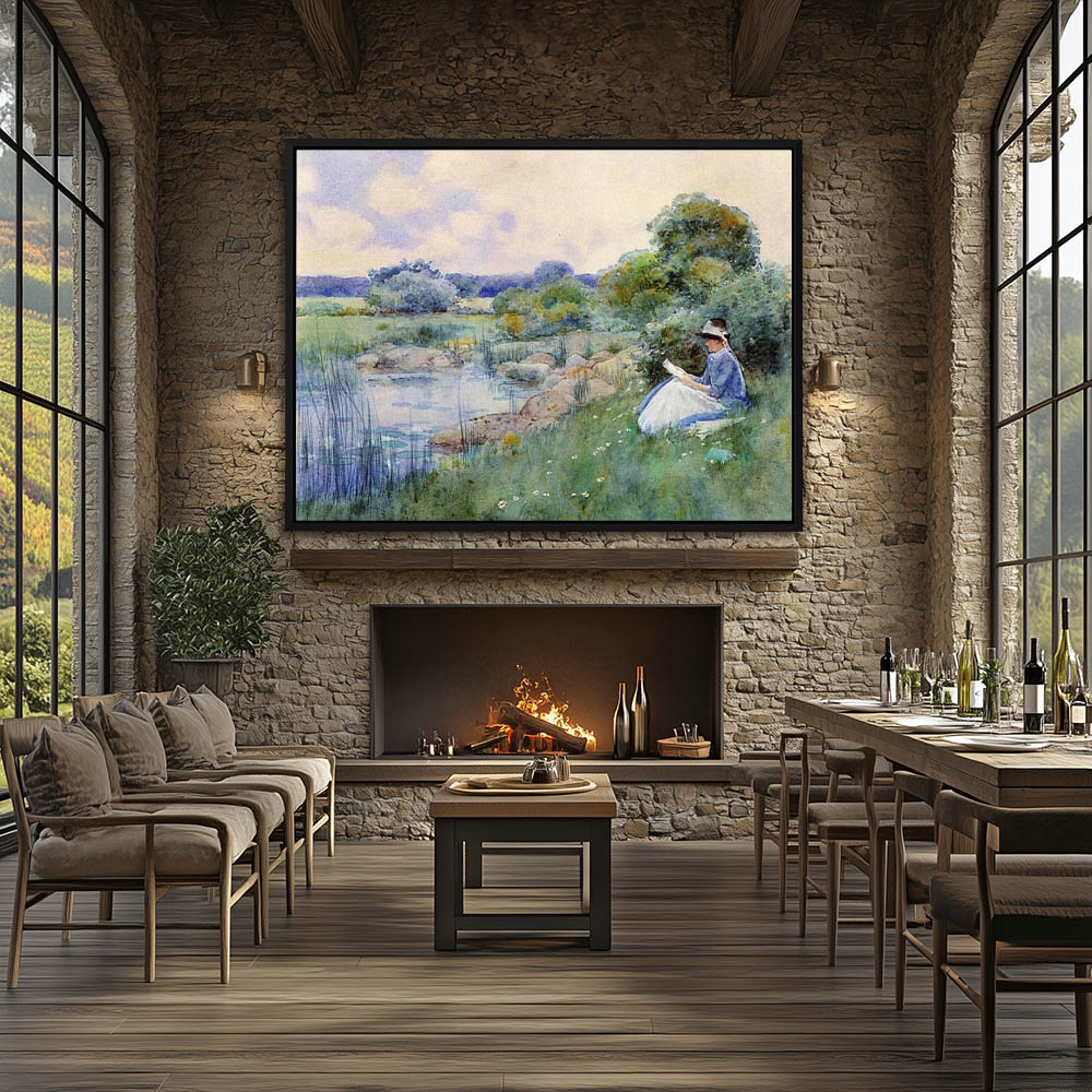 Vintage Landscape Painting with a Woman and Child Resting in a Meadow in Bloom