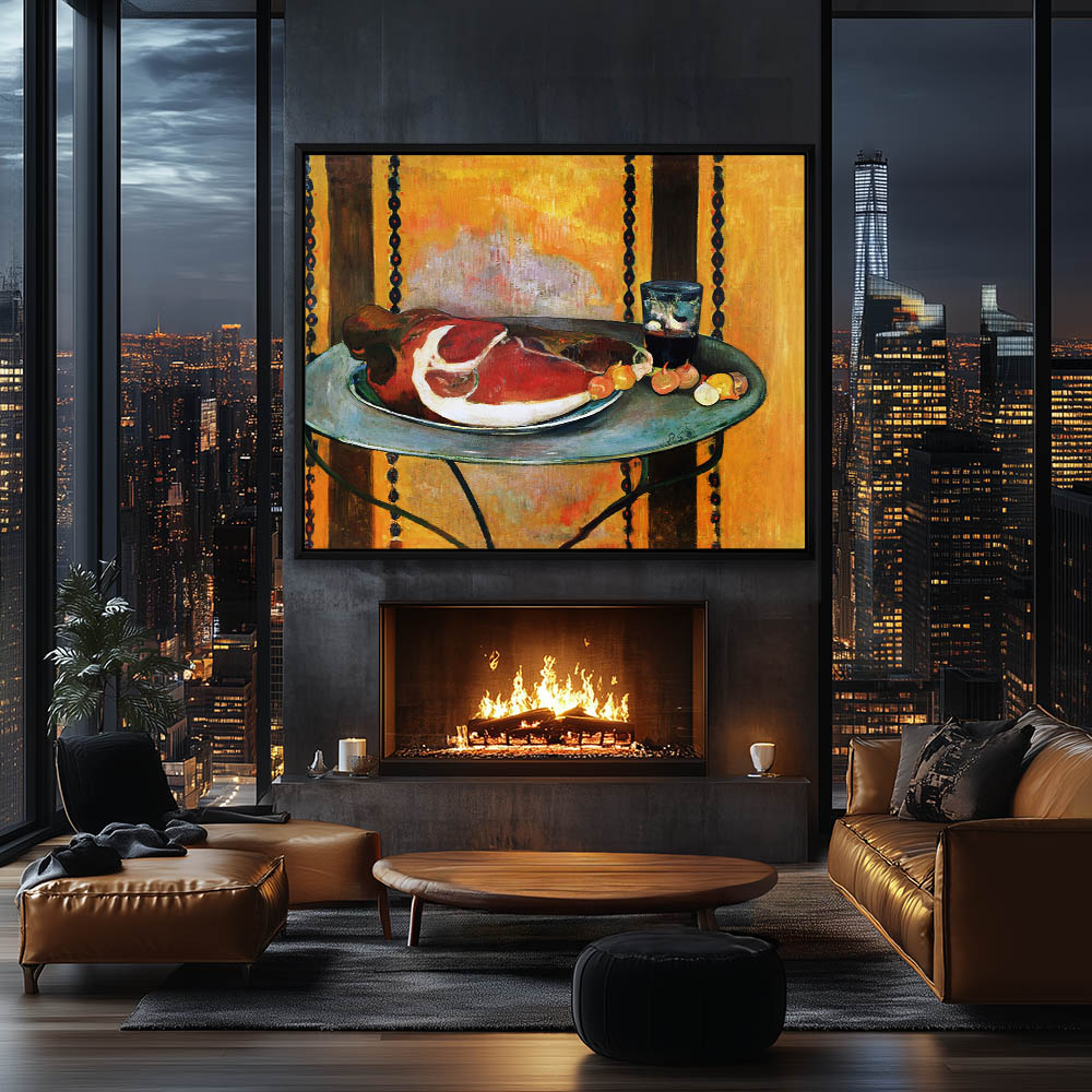 Abstract Still Life Painting with Plate a Pitcher Bread Cheese and Mug