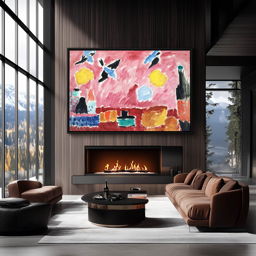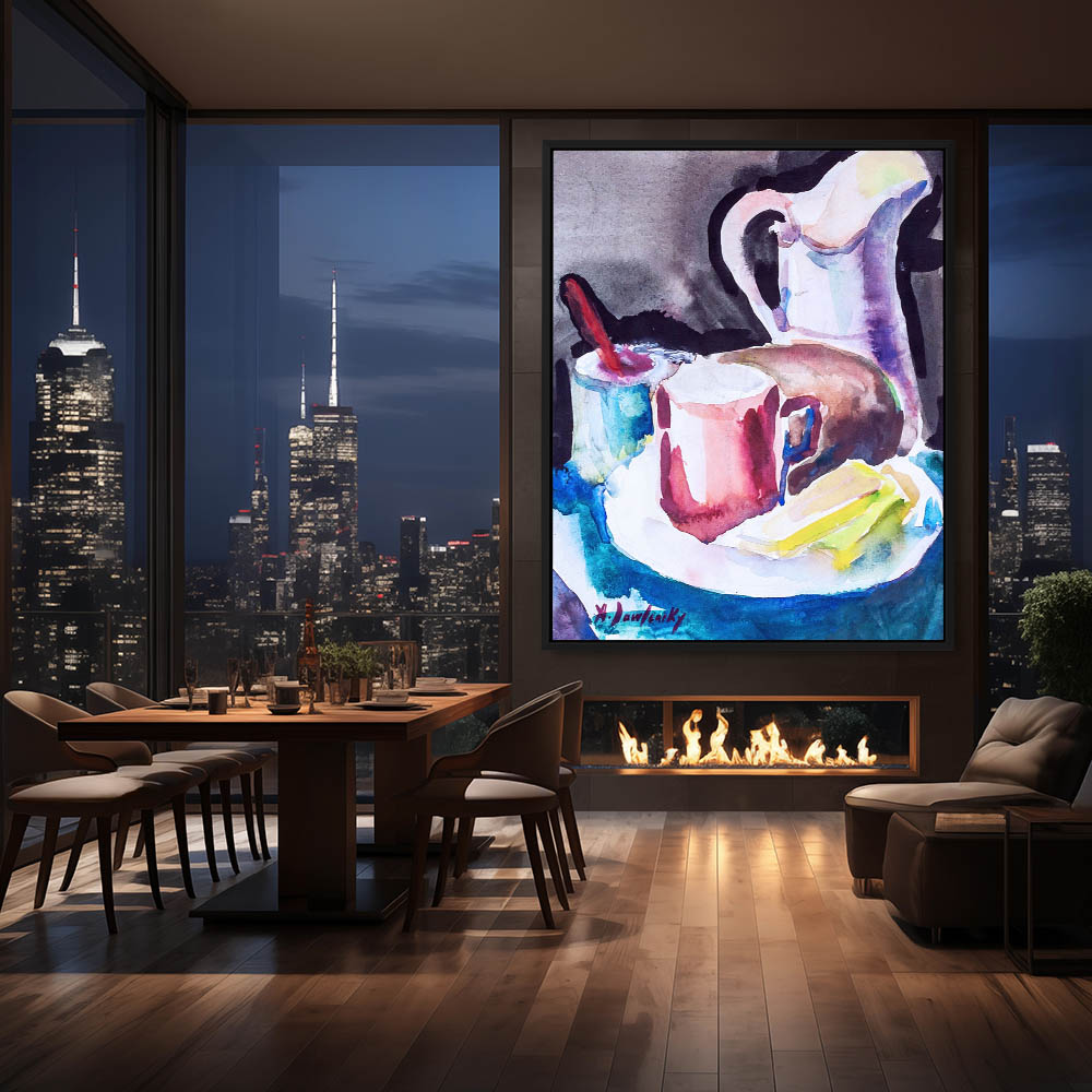 Abstract Still Life Painting with Pickle Jar a Cup and Plate and Apple