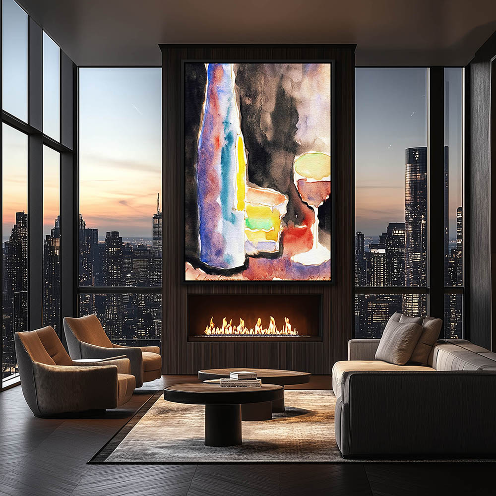 Abstract Still Life Watercolor Painting with Bottle and Glass